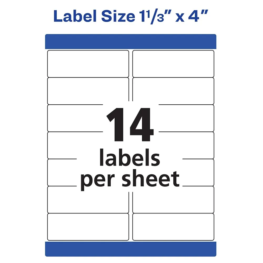 Choose the most secure labels that won’t peel or curl with Avery address labels using Ultrahold permanent adhesive. Avery Ultrahold adhesive sticks and stays, unlike basic labels, and applies securely to a wide range of surfaces including envelopes, cardboard, paper, plastic, glass, tin and metal. Avery labels feature proprietary Sure Feed(R) label technology that helps deliver a more reliable printer feed in order to avoid print misalignments and paper jams. Created with TrueBlock material, each label completely blocks out any text or colors underneath the label to make sure that your print is as clear as possible. These 1-1/3″ x 4″ labels are also resistant to damage from chemicals, scuffing, tearing, smudging and up to one year of outdoor UV light. Avery labels are heat and cold resistant, acceptable for food contact and can reach grade A barcode readability. Avery Design & Print makes it simple to customize labels from the comfort of your own home or business. The free browser-based software has all the tools you need to create labels for food containers, essential oils, lip gloss, lip balm and more. Try it out today at avery.com/templates. Please note that these labels are only compatible with laser printers.