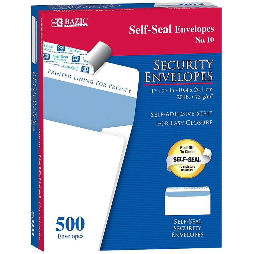 Standard size #10 white color envelopes, features blue security print inside the envelope. Each envelope has pre-applied adhesives on the reams of the closure. When you are ready to mail the envelope, just peel the strip off from the adhesives and press firm to seal the envelope. Includes 500 envelopes.