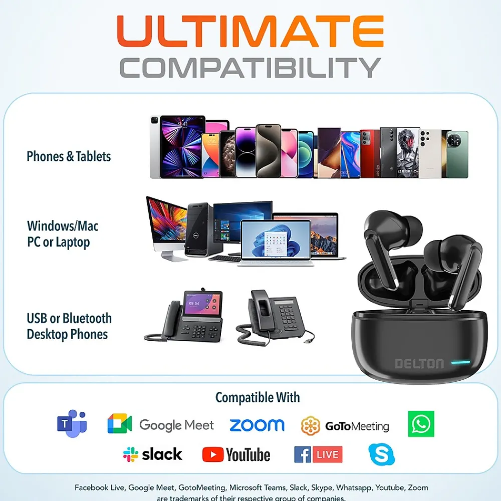 The Delton T70 computer headset is a perfect companion for productivity and seamless communication. With an impressive battery life of up to 5 hours of continuous use and an additional 27 hours available through the charging case, the T70 is always available when you need it to be. With soft cushions for extra comfort, crystal clear noise-canceling mic, outstanding sound quality, Active Noise Canceling technology and Transparency mode, it’s the perfect headset for any executive. Setup is a breeze with the included auto-pairing USB dongle: just plug in, and you’re good to go.