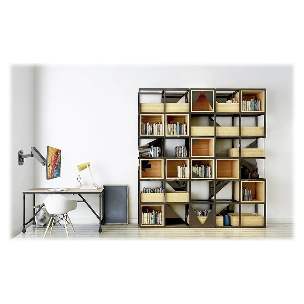 Premium quality durable gas spring assisted full-motion articulating monitor wall mount provides smooth, precise and effortless viewing height adjustment up to 11.02 inches. Rotating VESA plate supports portrait or landscape monitor orientation. Detachable VESA plate provides for easy monitor installation and adjustment. Compliant with VESA standard mounting hole pattern 75x75mm and 100x100mm to fit most 17″ to 32″ flat and curved monitors. Ergonomic enhanced features, include height adjustment, 180° arm swivel, monitor tilt angles of +/- 35° (upward/downward), and 180° (left/right) pan angle, provide unlimited viewing angle positions for optimal viewing comfort. Adjustable tension gas spring movement accommodates different weight loads to ensure smooth height adjustment, holds monitor weighing up to 17.6 lbs (8kg). The monitor arm can extend up to 16.61 inches from the wall, great for areas with severe space constraints. Integrated cable management system keeps cables neat, organized, and out of the way for a clean clutter-free desktop. Designed for single wood stud mounting fits perfectly into limited wall spaces for convenient and easy installation.