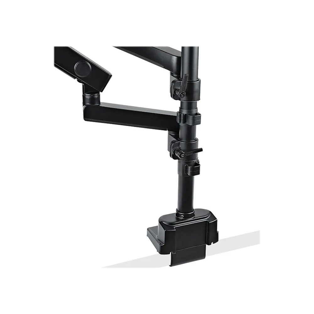 This dual monitor arm desk mount enables you to mount two monitors up to 32″. The arms are separately attached and stacked to the pole and are easily adjustable for horizontal or vertical monitor positioning. Its solid steel construction makes this monitor arm able to support 17.6lbs (8kg) each with two included mounting options (C-Clamp or Grommet mount) to securely attach your monitors to your desk.