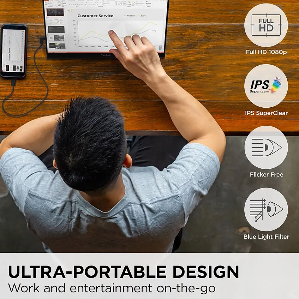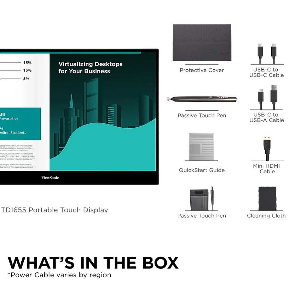 The ViewSonic TD1655 is a portable 15.6” touch display designed for productivity on the go. Built for business travelers, remote workers, and digital nomads, the TD1655 can serve as a complementary touchscreen to a laptop or tablet for boosted productivity. With an anti-glare screen and Full HD 1080p resolution, this touch display delivers a crystal-clear viewing experience so users can see more and do more for a more efficient workflow. In addition, with a 10-point projective capacitive touchscreen and included stylus pen, the TD1655 delivers a smooth and natural writing experience and streamlined navigation with every tap, pinch, and swipe. A USB Type-C port enables quick and easy transmission of video, and audio. A second USB Type-C port also delivers up to 60W of two-way power: a connected laptop can power the TD1655, OR the TD1655 can power a connected laptop via a USB-C power bank or AC adapter and outlet. Measuring less than an inch thick and weighing only two pounds, the ultra-slim TD1655 perfectly fits into any bag, briefcase, or backpack so you can work wherever life takes you.