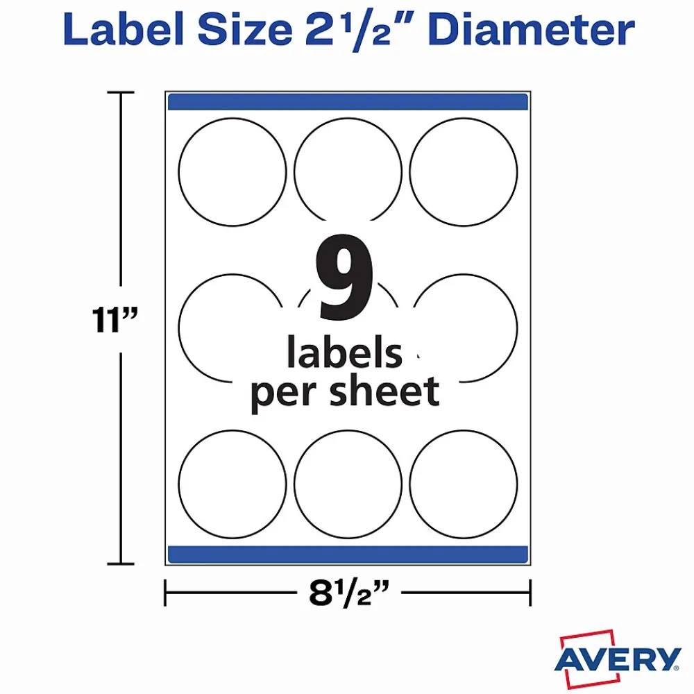 Make sure your handmade gifts and products stand out with Avery matte white round labels that offer the professional finishing touch you need. Our print-to-the-edge capability allows you to create bright, eye-catching full bleed labels with sharp text and crisp images printed right to the edge of the round printable stickers with no border or margin. Sure Feed(R) technology helps deliver a more reliable feed through your printer to prevent print misalignments and paper jams. These round printable stickers are quick and easy to apply with our patented Easy Peel label sheets with Pop-up Edge. Simply fold the sheet back to display the label edges for convenient and fast peeling that saves time and avoids label waste. The 8.5″ x 11″ blank label sheets are compatible with both laser and inkjet printers to provide crisp and vivid prints. Avery Design & Print makes it easy to create customized labels from your own home or business. The free browser-based software has everything you need to design gift labels, soap labels, thank you stickers, round stickers for kids, party favor labels and more. Try it out today at avery.com/templates. This item comes with 9 labels per sheet and includes 25 sheets for a total of 225 blank white labels.