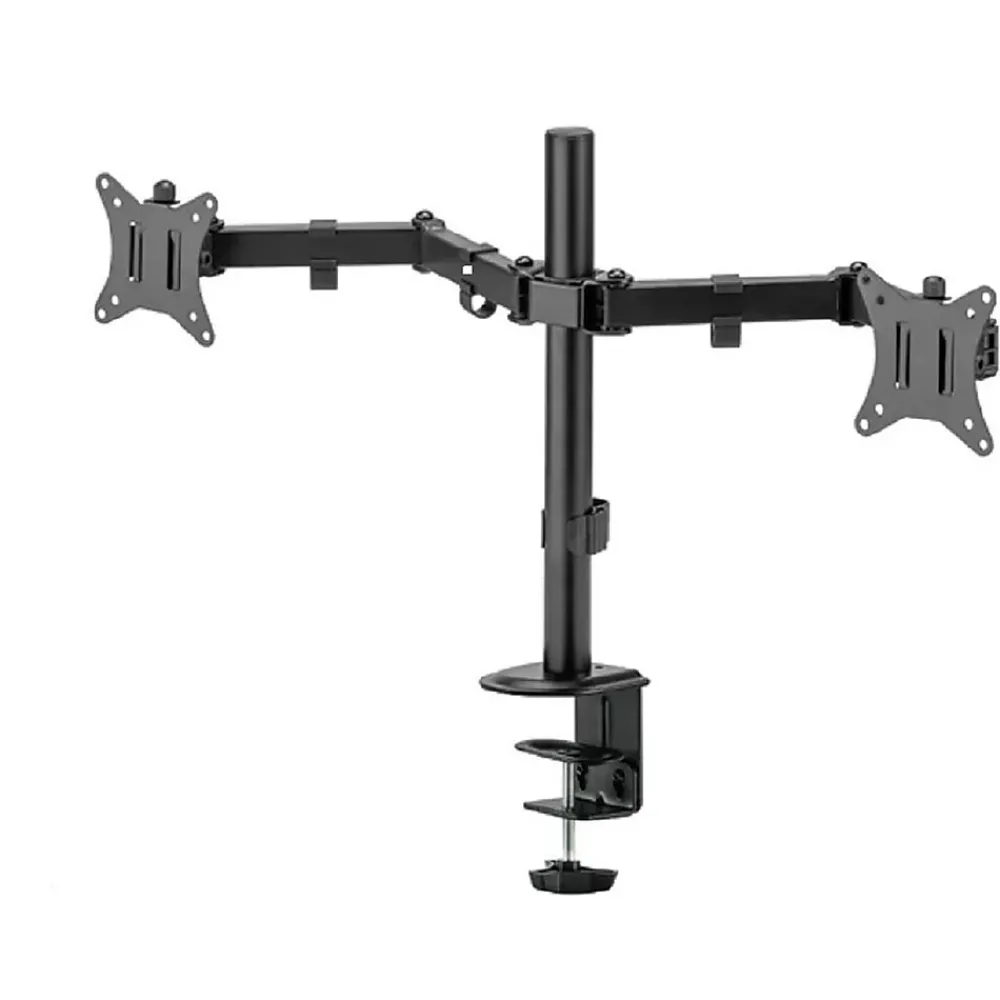 The dual monitor desk mount accommodates flat or curved monitors weighing up to 17.6 lbs (8 kg) each. It offers five movements: height adjustment, rotation, fold, swivel, and tilt. The minimum height from the screen connection center to the desk is 2.4 inches (6 cm), while the maximum height is 15.2 inches (38.5 cm). Assembly is quick and easy, with no drilling required for surfaces up to 3.3 inches (8.5 cm) thick. Additionally, it can be permanently connected to the desk using included screws. The mount ensures a wide range of movement for an ergonomically suitable viewing position. It supports VESA standard sizes of 75×75 mm and 100×100 mm, safety-tested for a load of 33 lbs (18 kg) per arm. The mount is also compatible with larger screen sizes, provided their specifications align with the mount.
