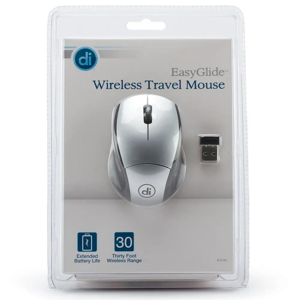 Digital Innovations EasyGlide Wireless Travel Mouse is compact, comfortable, reliable and easy to set up. It features up to eight months of battery life and offers up to 30 feet of reliable wireless reception. A power saving On/Off feature helps conserve batteries while the scroll wheel provides easy navigation of web pages and documents. It’s textured for a sure grip and comfortable for left and right handed use. Limited lifetime warranty and free technical support. Includes Micro Innovations EasyGlide Wireless Travel Mouse, USB receiver, one AAA battery and a Quick Start Guide. 3-year Limited Warranty.