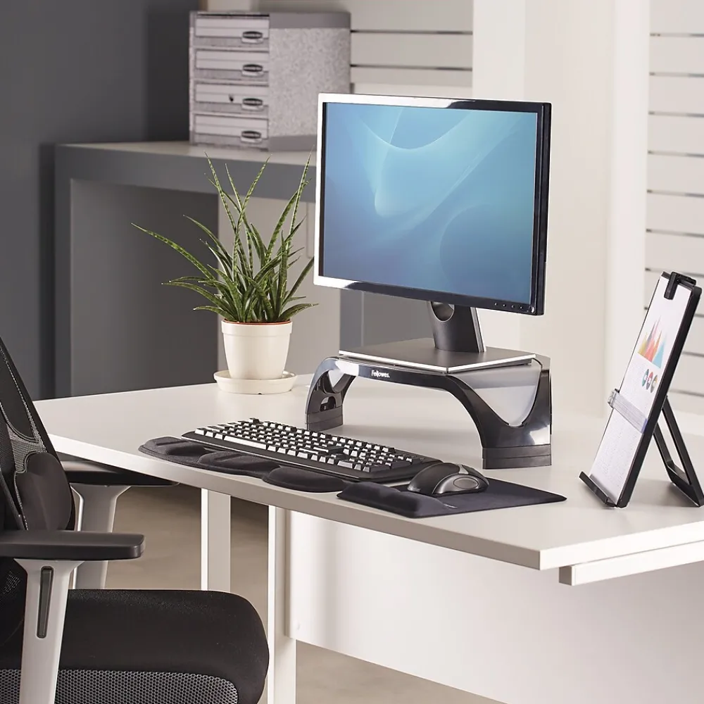 Elevate a screen to eye level with this Smart Suites corner monitor riser. The triangular design ensures easy placement into corner spaces to save space, and it can support up to 40 pounds. With three different height adjustments in this Fellowes corner monitor riser, it is easy to find the ideal height to reduce the stress on necks and backs during long working hours.