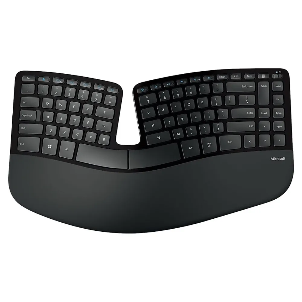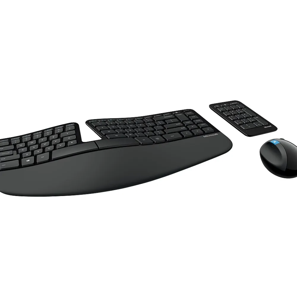 Rethink the way you approach typing and scrolling every day with this Microsoft Sculpt ergonomic desktop combo pack. The curved keyboard design puts your hands and wrists in a comfortable, natural position, and the separate numeric keypad allows for fast, easy data entry from anywhere on your desk. Featuring four-way scrolling, the uniquely angled mouse makes it easy to navigate through websites and complex software applications. This desktop set connects to your computer using a wireless USB receiver, making setup a simple task. Connect this Microsoft Sculpt ergonomic desktop combo pack to your Windows-based desktop or laptop for a more comfortable arrangement, and tuck it into a briefcase or suitcase when you’re ready to take your office on the road.