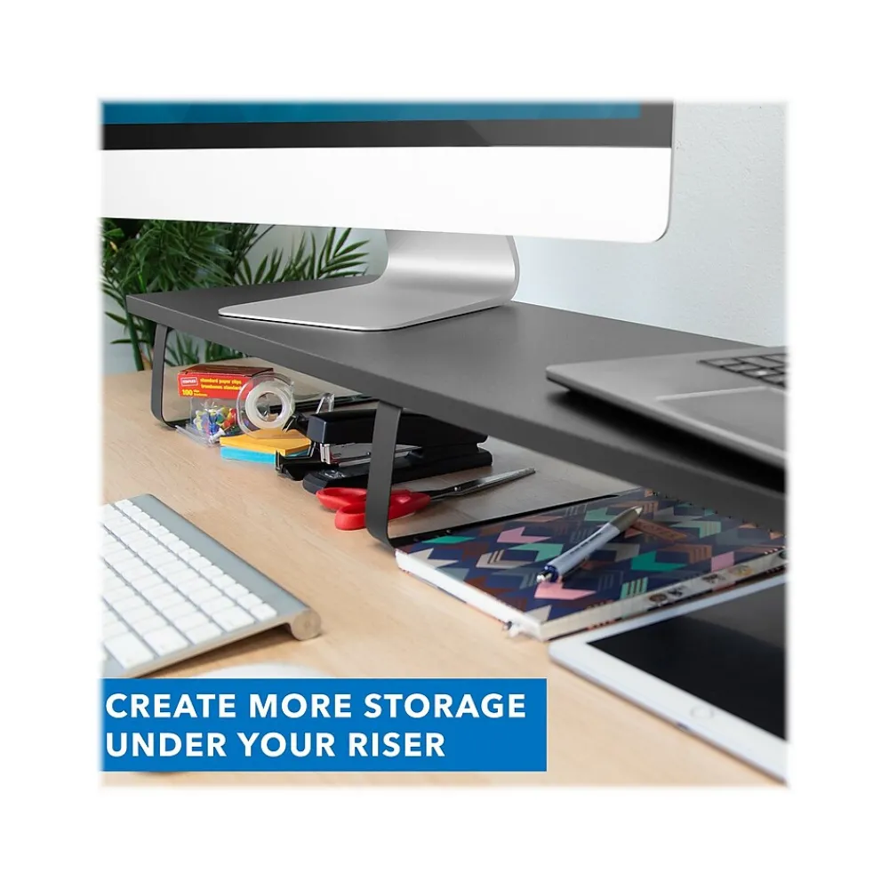 - SPACE SAVING STORAGE: Place your dual monitor setup on this riser without taking up any additional space. The extra storage underneath reduces clutter and is great for storing away your keyboard, mouse, or other home office supplies.