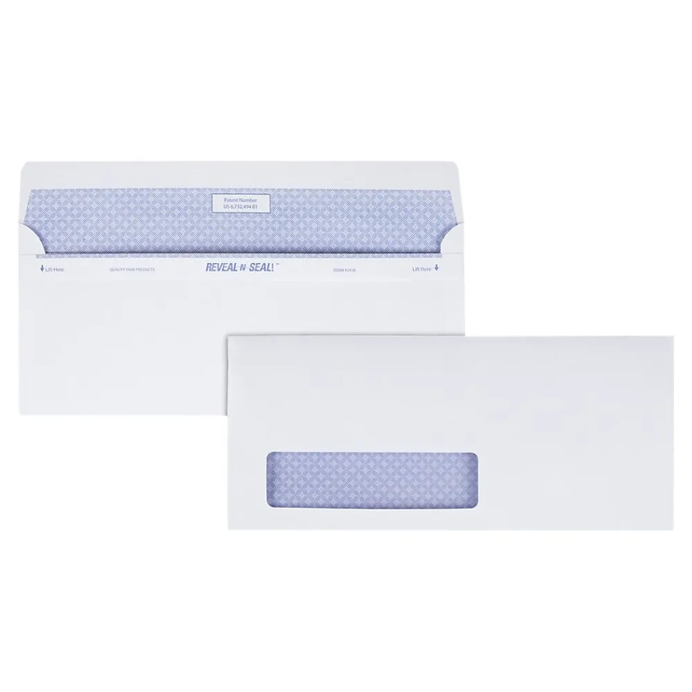 Keep confidential information away from prying eyes with these instant-seal security envelopes. Each one is manufactured with premium 24-pound wove paper, making it ideal for everyday business and personal use, while the bright white coloring delivers a clean, professional look. These Quality Park Reveal-N-Seal single-window envelopes feature a self-seal closure that eliminates the need to moisten the flap or use a pull-off strip.