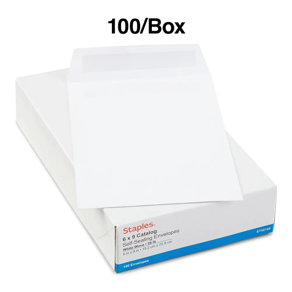 Mail invoices, cards and flyers with these Staples white wove self-sealing catalog envelopes. Each envelope has a pressure-activated adhesive that lets you securely close it without trouble, ensuring contents arrive in pristine condition. These Staples white wove self-sealing catalog envelopes are made with 28-pound white wove material that offers a clean, simple appearance while providing durability.