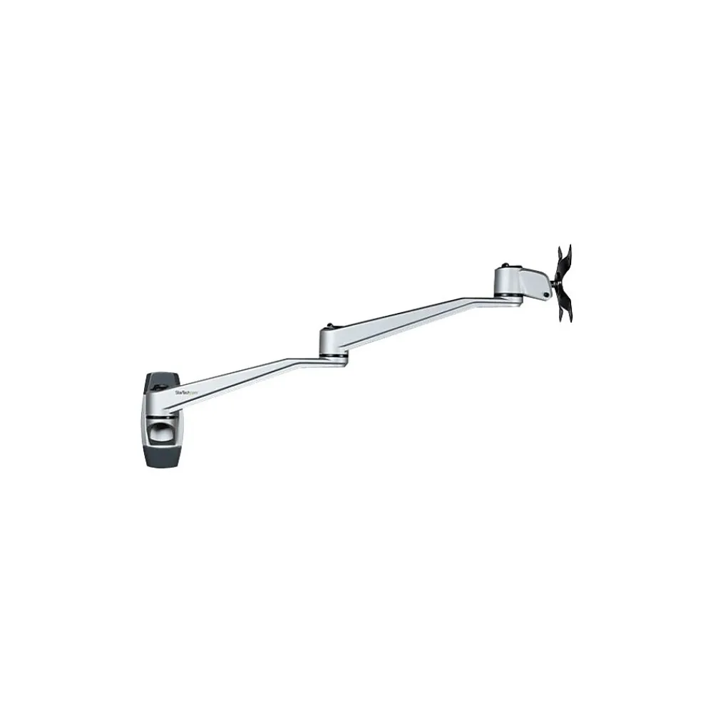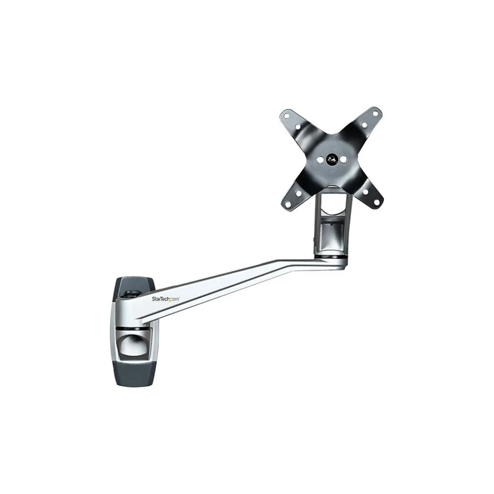Single-Display Wall Mount Aluminum Tool-less Assembly| For up to 34″ Monitors. Free up space with this wall-mount monitor arm and enjoy optimum viewing with the long dual-swivel extension arm. The premium design ensures smooth, effortless motion and makes it easy to re-position your display, to work in comfort or collaborate with others. The attractive silver finish complements your decor. The wall-mount system is ideal for business, healthcare, financial or other settings, where you may want to share your screen, or for customer-facing interactive displays. Adjust the Dual-Swivel Arm with Ease The wall-mount monitor arm extends a full 20.4″ (52 cm) and has three swivel points, offering an extended range of motion. Move the dual-swivel arms left or right, to change your screen position. You can also adjust the swivel tension. Durable and Stable Construction The robust aluminum design provides a stable wall-mount for your computer monitor or flat-screen TV up to 34″. It’s ideal for touch-screen stability. The universal display wall mount supports VESA mount monitors (75×75, 100×100) up to 30.9 lb. (14 kg) in weight. Adjust your Viewing Angle Share your screen with ease. The display wall mount offers a full +180-degree/-180-degree pan, to move your screen left or right. It tilts freely +90/-15-degrees, to adjust the angle up or down. Rotate your screen for landscape or portrait viewing. Low-Profile Design Push the swivel arm back to the wall, so your monitor sits just 5″ (129 mm) from the wall when not in use. Tool-less Assembly The quick slide-and-click connections make the monitor wall mount easy to assemble and saves time when setting up multiple units. The TAA compliant ARMWALLDSLP is backed by a StarTech.com 10-year warranty and free lifetime technical support.