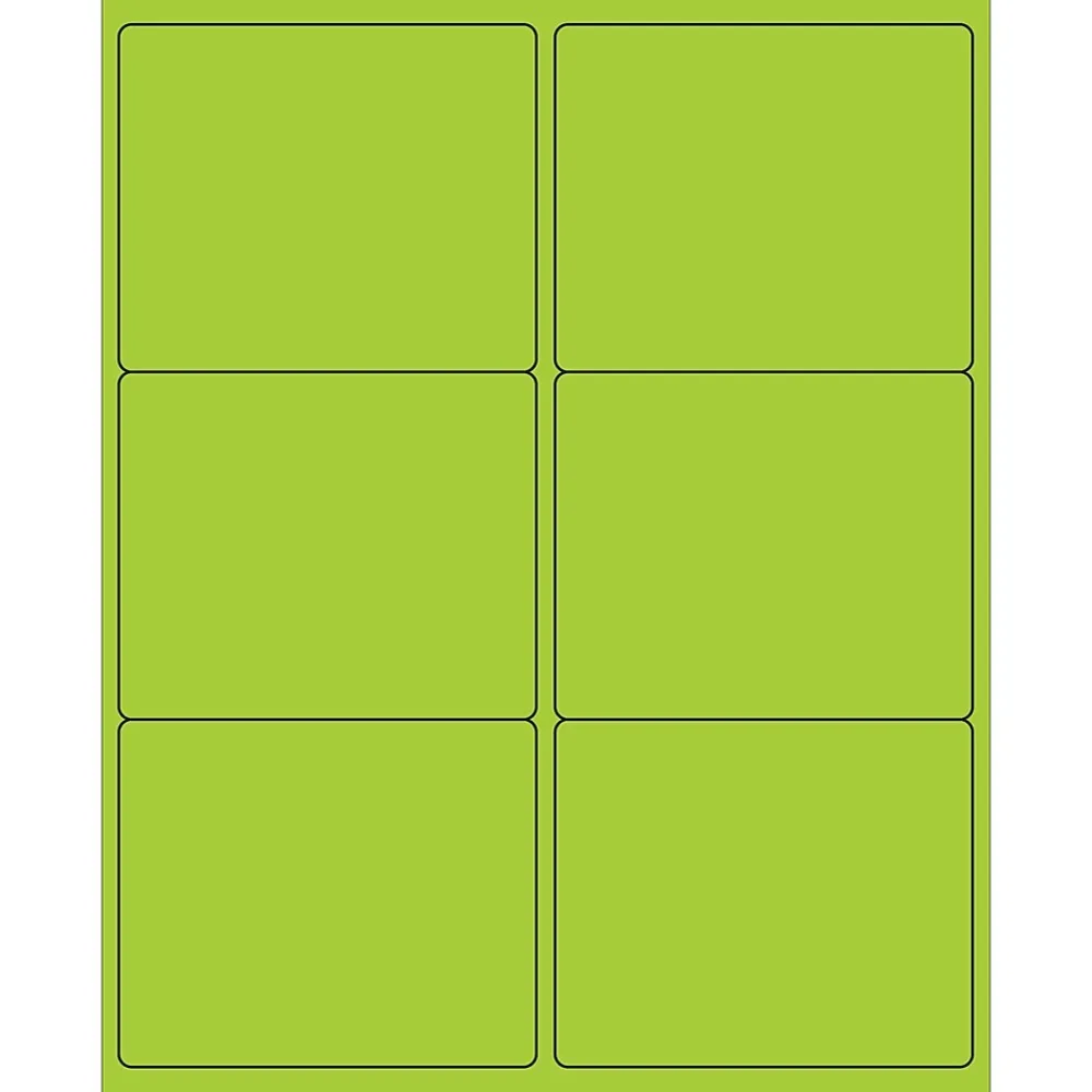 4″ x 3 1/3″ Fluorescent Green Rectangle Laser Labels. Use to create your own product or mailing labels. Labels work with both Laser and ink jet printers. Permanent adhesive. Labels stick to a variety of smooth surfaces including paper, corrugated, plastic, wood, glass and metal.
