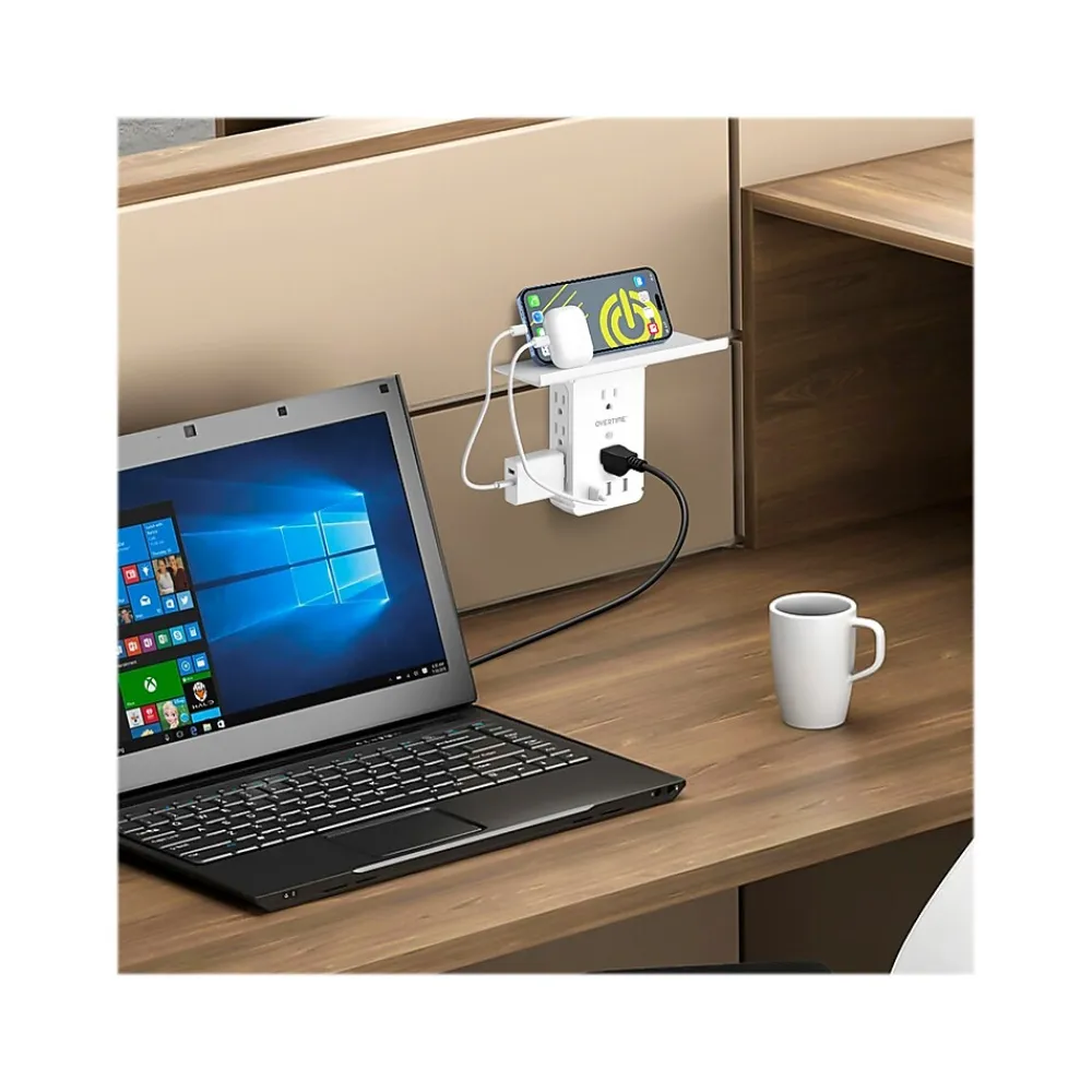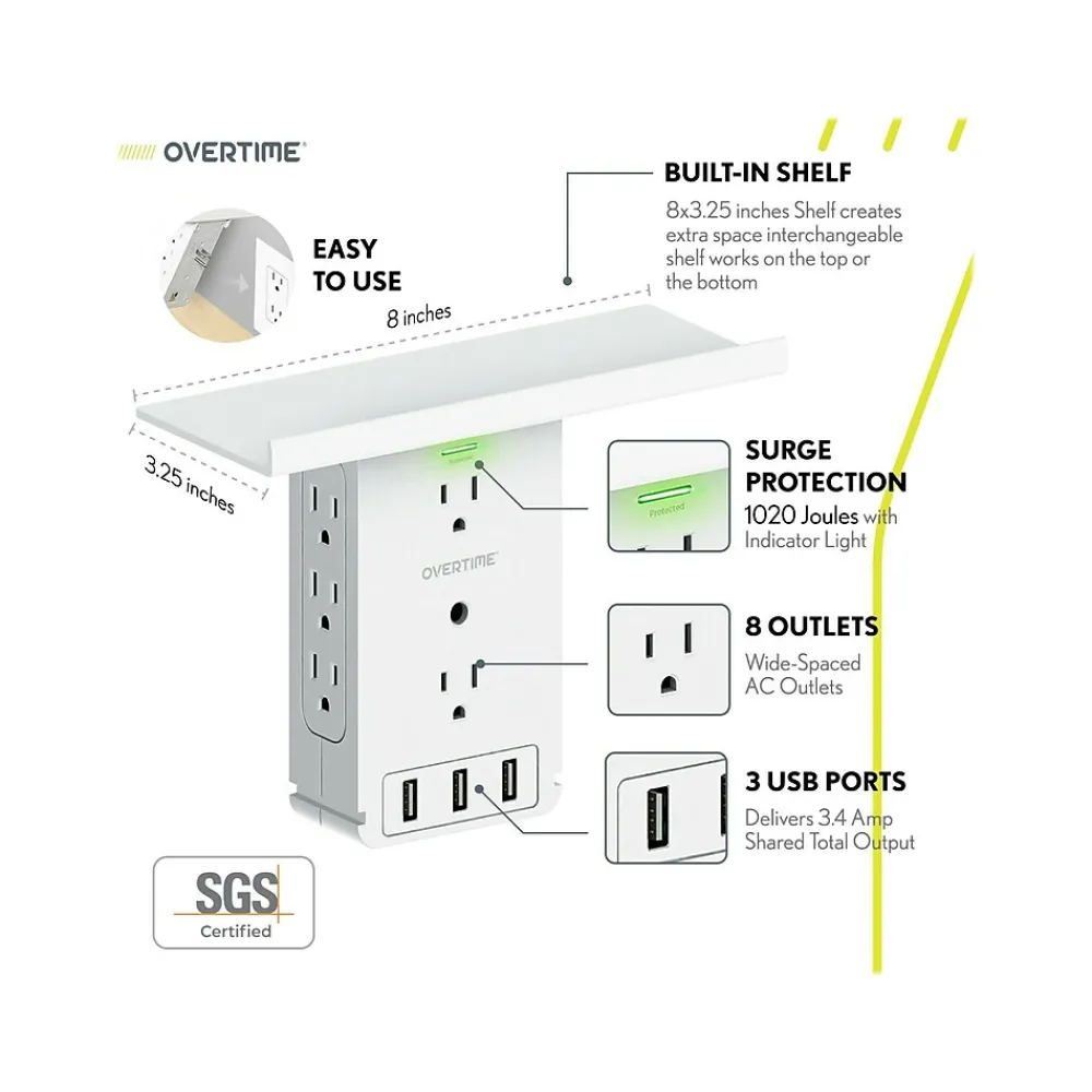 The Overtime wall mounted socket shelf charging station is a smart solution for anyone who needs more outlets and USB ports. With eight outlets and three USB ports, this surge protecting outlet extension offers plenty of power and charging options. The convenient shelf can rest on top or on the bottom of the device and allows you to rest your phone, Alexa, or other device while it’s plugged in. The unit is easy to install and provides up to 1200J of surge protection, overheating protection, short circuit protection, and over voltage protection, making it a safe and convenient way to charge or power all of your electronics.