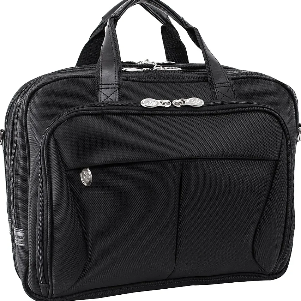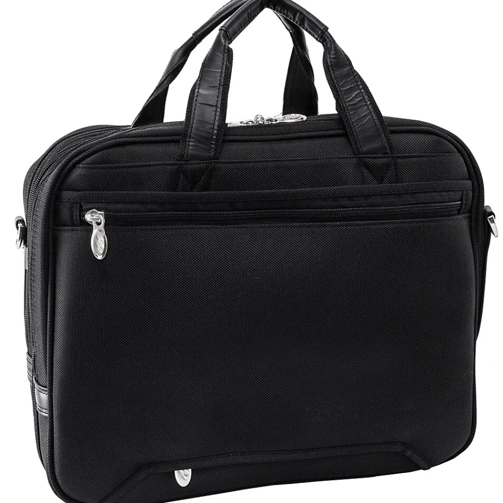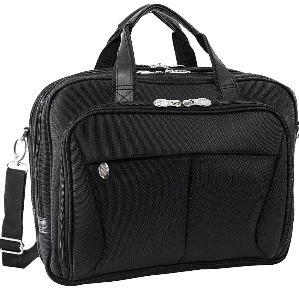 Nylon briefcase with front zipper pocket for small miscellaneous items. Front organizer with storage space for media devices, cell phone, business cards, key holder and pens. Front compartment features file divider for documents with an expandable feature to provide 3% more storage space. Back Compartment padded with high-density foam to protect most laptops up to 17″ in size. Smart Zipper Attachment allows easy attachment on extended handles of other rolling cases and luggage. Removable shoulder strap included.