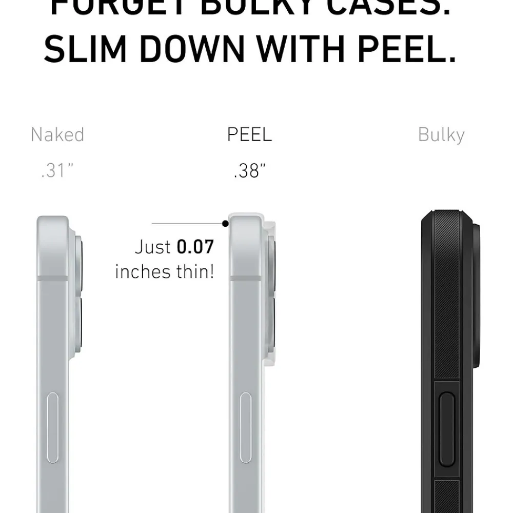 The thin, magnetic iPhone 15 Plus case is designed to keep the original look and feel of your phone while protecting it and allowing for Magnetic charging. Features an impact-resistant polycarbonate back for enhanced protection, TPU sidewalls for shock absorption, and a comfortable grip. Ditch the bulk and slim down with Peel.