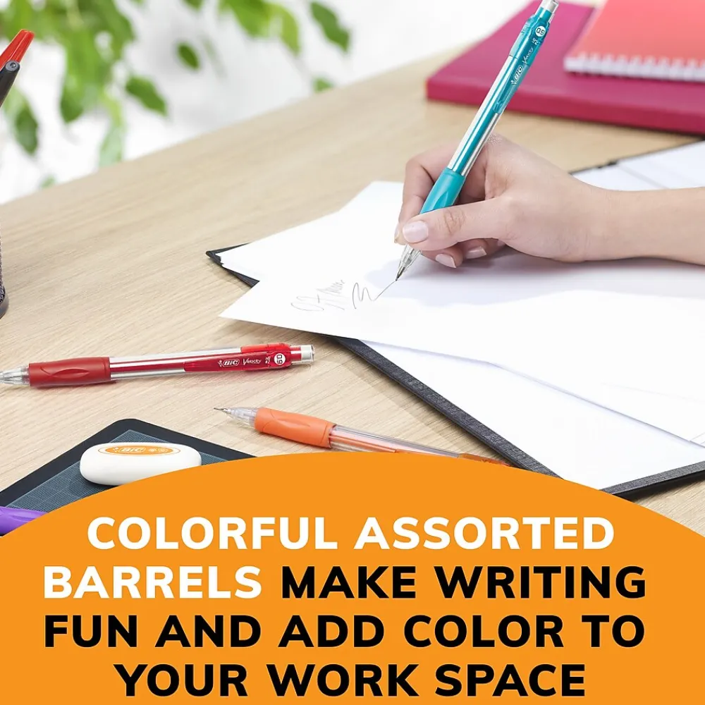 These 0.9mm mechanical pencils have a thick point that’s ideal for a variety of everyday writing activities. The strong lead doesn’t smudge and erases cleanly, so your work looks neat and professional. Convenient and reliable, BIC Velocity Number 2 Mechanical Pencils 0.9 mm are always ready and never need sharpening; to advance the pencil lead, simply click the built-in eraser. These Bic mechanical pencils have a sophisticated, modern look, and their colorful clips easily attach to pockets, notebooks and more. The No. 1 selling mechanical pencil brand in the United States*, BIC offers dependable performance and value that you can trust. Looking for larger quantities of school or office supplies? Choose BIC Mechanical Pencils With Erasers for a high-quality, safe and affordable product you can trust. *Source: The NPD Group/Retail Tracking Service and Commercial Tracking Service, U.S., based on actual unit sales, 12ME June 2022 combined.
