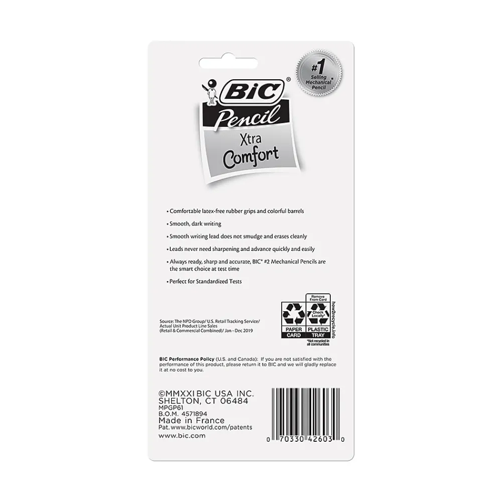Perform calculations or write essays with these 0.7mm mechanical pencils. Each one has a rubber eraser that removes unwanted marks cleanly. These BIC Xtra Comfort mechanical pencils feature a 0.7mm tip for producing smooth, bold lines.
