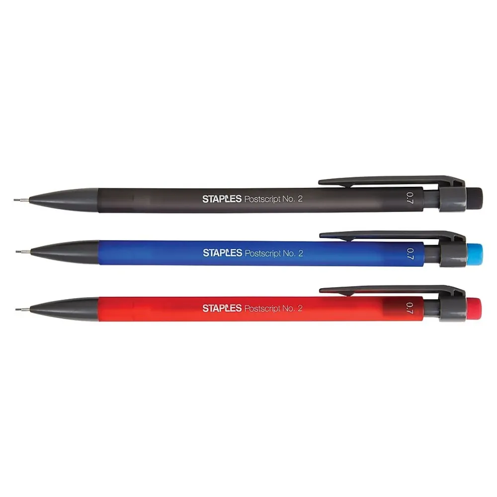 Make calculations and perform other writing tasks with these 0.7mm assorted No. 2 mechanical pencils. Each pencil has a durable rubber eraser that lets you correct mistakes without leaving dark messes behind. These Staples Postscript assorted mechanical pencils have a 0.7mm tip for smooth writing, while the plastic clip lets you carry them in a notebook or pocket with ease.