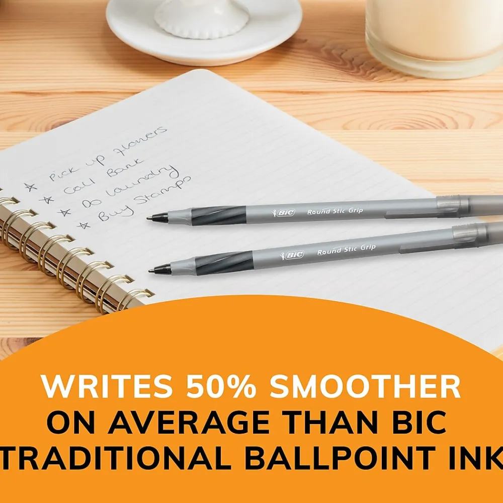 Write lengthy letters, journal entries, and other papers comfortably by using these fine-point pens. Featuring textured finger grips, these pens offer a comfortable hold and increased control when writing, while the 0.8mm fine-point tips provide enhanced precision and accuracy. These BIC Round Stic Grip Xtra Comfort black ballpoint pens come with 12 to a pack, making it easy to stock up the office, home, or classroom.