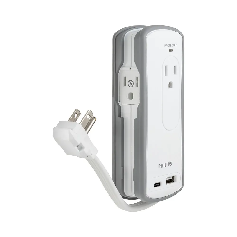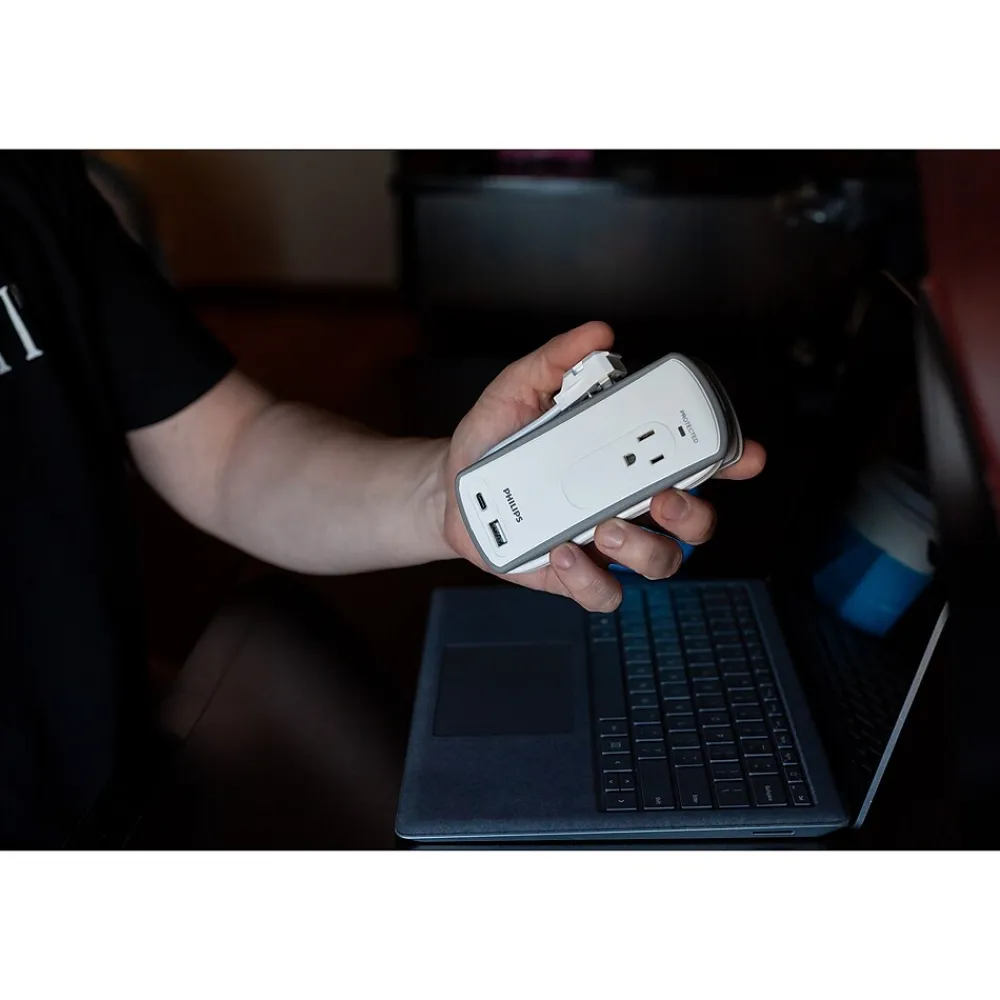 Your power does more with the Philips two-outlet, two USB port travel surge protector. The extra-convenient, compact design of the surge protector includes a grounded outlet on the front and back of the device. Additionally, there is one USB Type-A port and one USB Type-C port on the front of the device that has 3.4A of combined charging capacity to quickly power smartphones, cameras, watches, or other mobile devices. The 1′ cord allows easy extension where needed, and the space-saving flat plug conveniently fits in tight spaces, such as behind desks, beds, sofas, and other furniture. Built-in cable management stores the cord when not in use and makes packing the device easy for all your travels. With 300 joules of surge protection and an integrated LED that indicates when your devices are protected, rest assured that your devices are safe from voltage spikes while traveling. Additionally, automatic shutdown technology cuts the flow of electricity should the maximum amperage be surpassed.