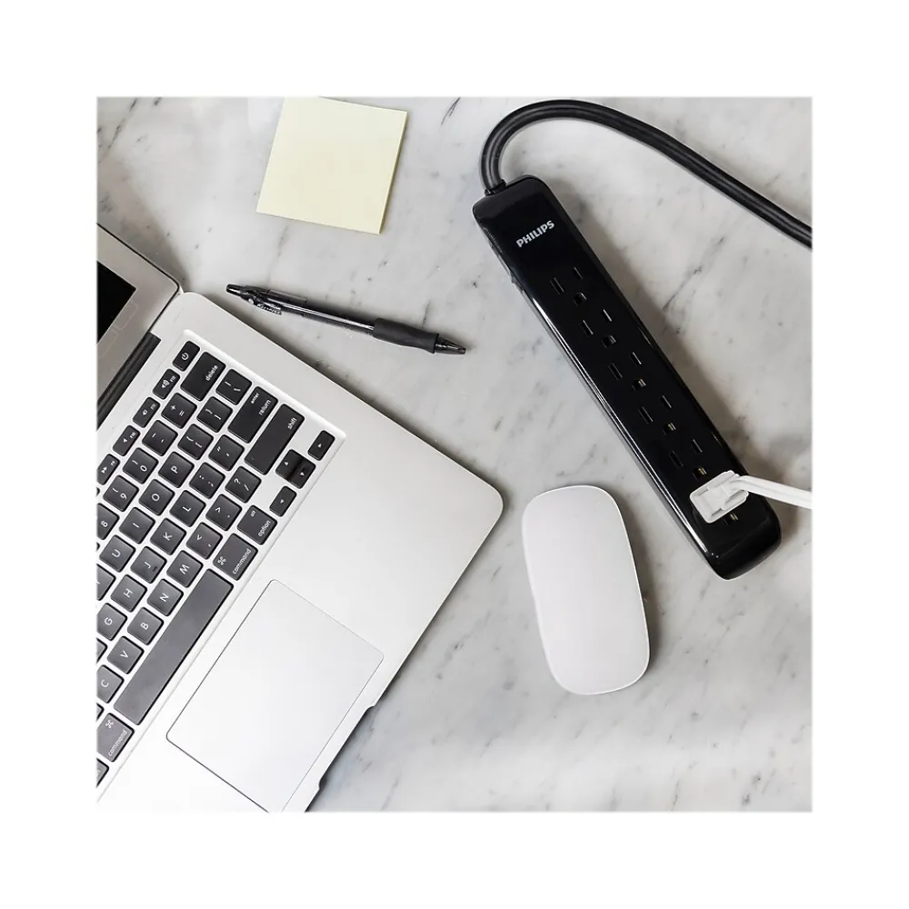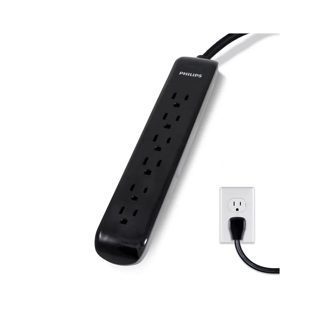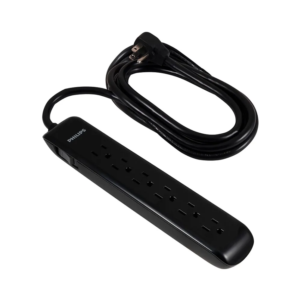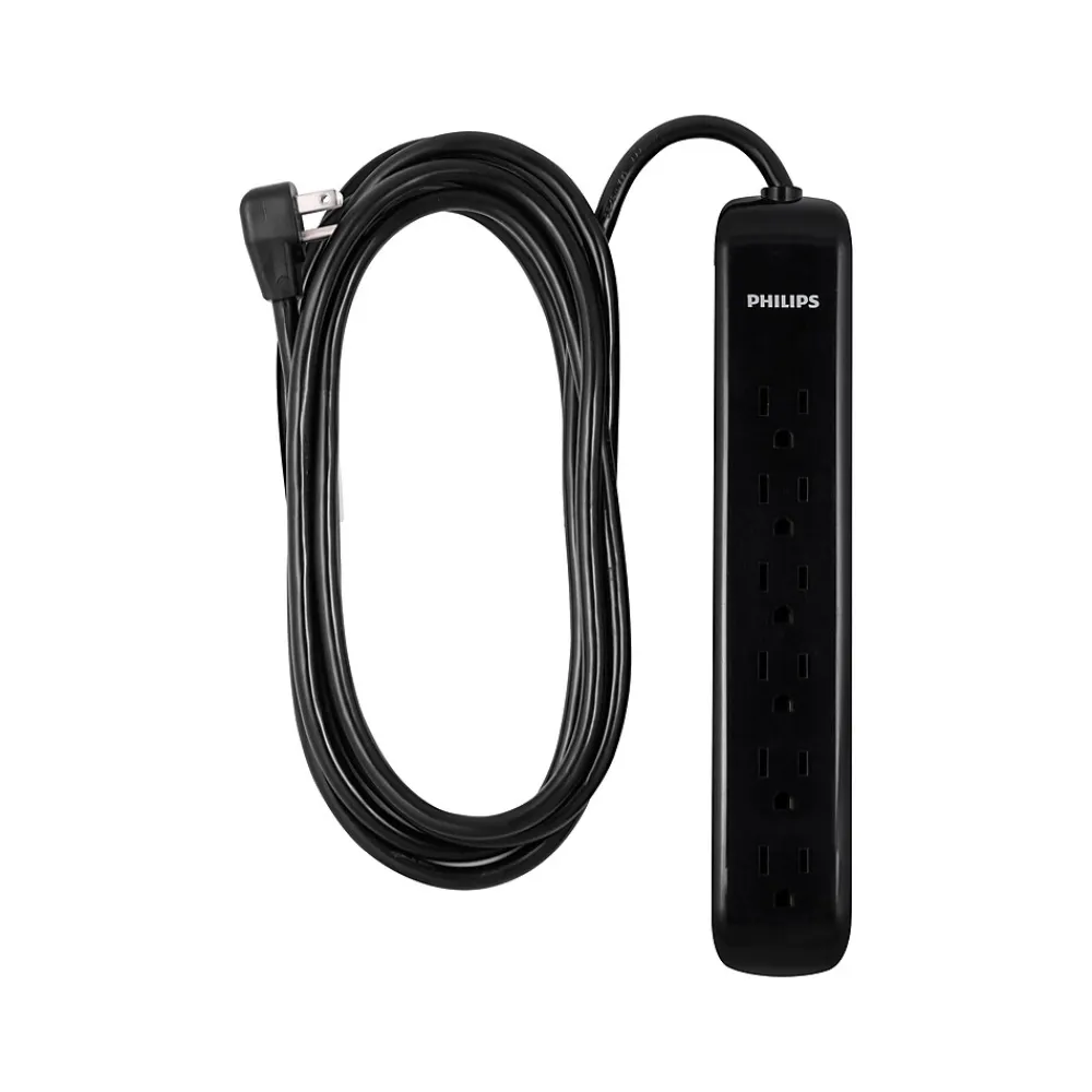 Your power does more with the Philips six-outlet surge protector. Converting one outlet into six, this powerful extension cord adds more outlets where you need them most and keeps your electronics protected from dangerous power surges. The surge protector features an integrated circuit breaker that protects your electronics if the capacity is exceeded by a power surge and automatic shutdown technology to cut power if the components expire. It also features a surge protection rating of 1080 joules to ensure your electronics are safeguarded against voltage spikes. The surge protector’s extra-long 10′ heavy-duty power cord is connected to a flat plug, allowing it to plug in easily behind desks, sofas, and other furniture. Featuring a durable construction and sophisticated black finish, the power cord increases the cable’s durability and blends in with existing decor. For use in grounded (three-prong) outlets only, this product comes equipped with a $75000 connected equipment policy and is backed by a lifetime-limited no-hassle replacement plan. Your outlet deserves an upgrade with the Philips six-outlet surge protector.