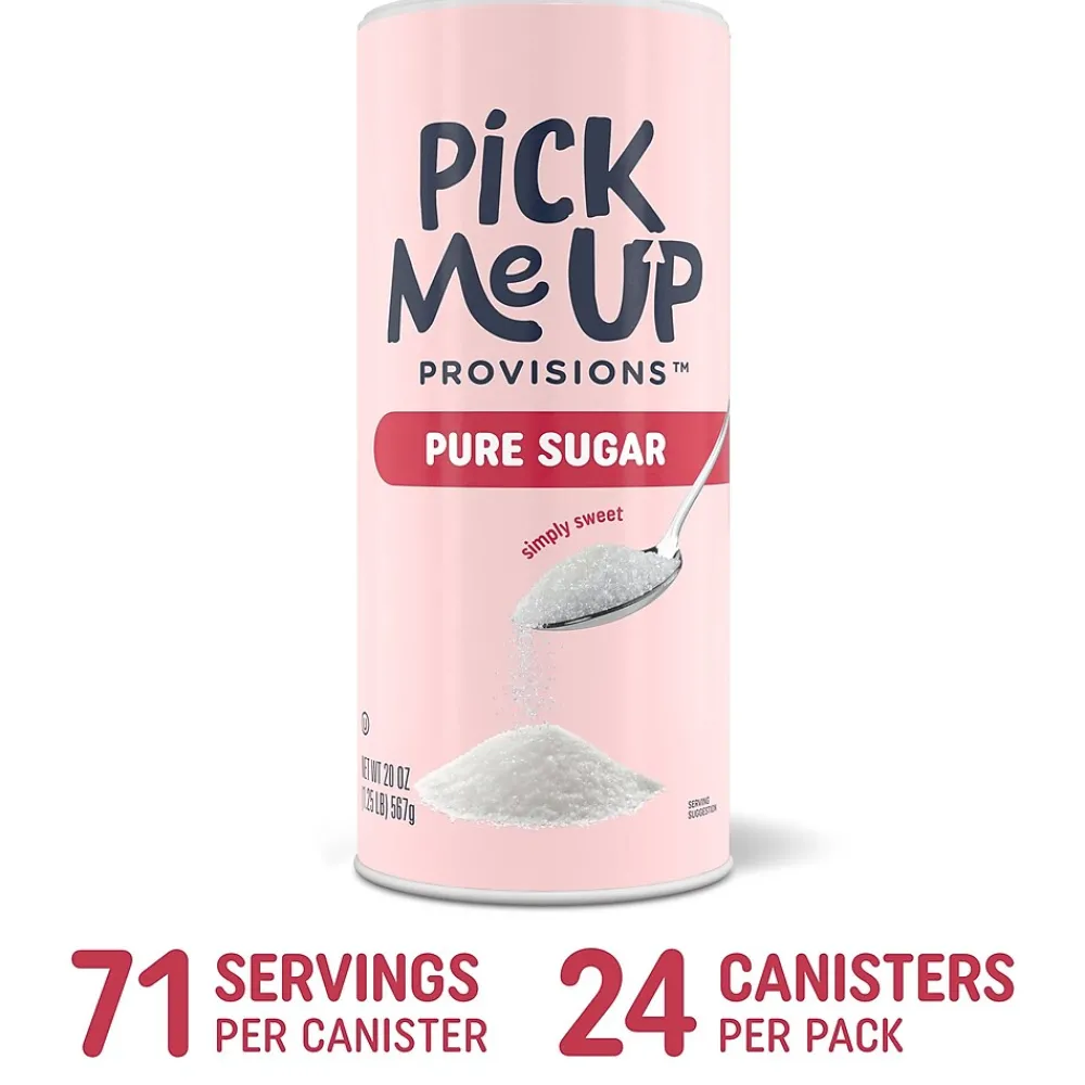 Stock up on the sweetness in your office breakroom or coffee station with this 24-pack of Pick Me Up Provisions pure cane sugar in 20-ounce canisters. Add pizzazz to coffees, teas, and other drinks and bring smiles to the faces of your colleagues and clients. This 100% pure sugar is resealable to prevent spills and keep it fresh for as long as you need it so it’s always ready to give you and your colleagues a boost during the workday. Stock up your coffee bar for mornings, lunches, and mid-afternoons of endless coffee enjoyment. Natural sweeteners are the perfect complement to coffee or tea, so give people a perk in their day.