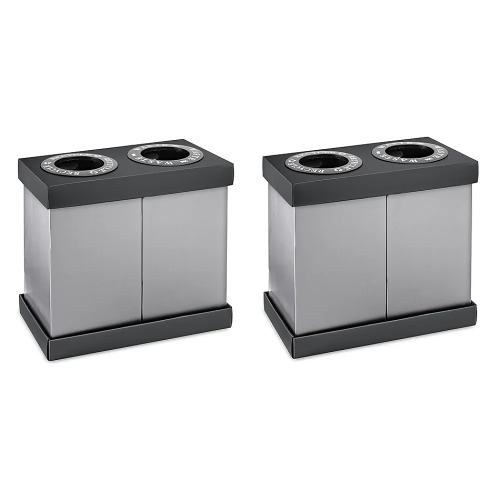 If you are looking for an attractive alternative to exposed garbage bags and other unsightly means of sorting trash from recyclables, the Alpine Industries waste and recycling bins are just the ticket. Lightweight, easily assembled and made of strong and durable corrugated plastic. Designed for indoor use in hospitality suites, meeting areas, dinners and similar venues, they perform best when bins are used as containers for disposable trash bags. Labels included for glass, plastic, paper, recyclables, cans and waste for 12 in. deposit openings. Set of 2.