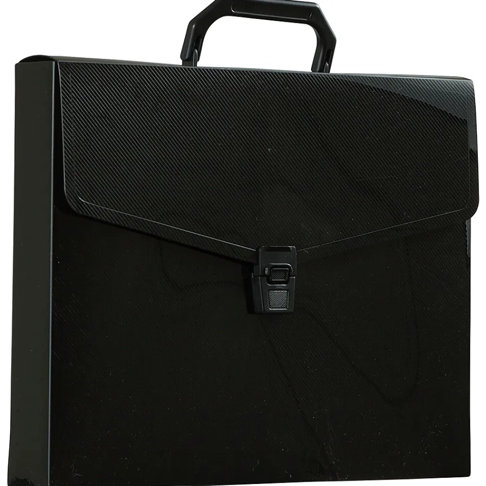 JAM PaperĀ® Black Plastic Portfolio Briefcase with Handles measures 12 x 9.5 x 1.5 inches in size and is made out of smooth, durable poly plastic. Featuring a solid black color, this case will appear professional in any office or academic setting and will keep the contents inside of it hidden from sight. To make carrying it from place to place simple and easy, this portfolio has a black plastic handle. It opens up in the front with a vflap and closes with a black plastic closure. This case is sold individually. Use it to store, protect, and carry your important documents. Whether you need to carry files to your office, spreadsheets to that next meeting, or advertising materials to a sales call, this portfolio will help you get the job done.