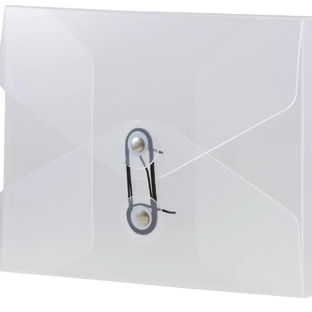 JAM PaperĀ® Clear Frost Small Portfolio with Button & String Closure measures 5 1/4 x 63/4 x 3/8 inches in size and is sold individually. Made out of smooth and durable transparent plastic, this portfolio has a clear quality with a frosted finish. It features a vflap opening and a reliable two-button and string-tie closure. Both buttons are made of the same clear plastic as the case and have round, shiny metal rivets in the center. The string that wraps around these buttons to keep the portfolio closed is black. Use this small plastic case to carry and protect index cards, notes, post cards, stationery, pens, pencils, and more!