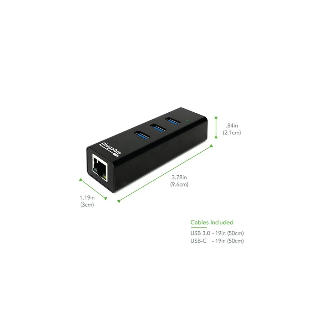 The Plugable USB hub is a simple solution for adding an Ethernet connection to your laptop, ultrabook, and notebook or upgrading your network adapter in your desktop PC. You can also add additional network interfaces and transfer files peer-to-peer over the hub’s wired Gigabit Ethernet network. With three additional USB 3.0 ports, get the connectivity you need. Increase your productivity by adding a flash drive, keyboard, and mouse. Please note that this product is not a solution for connecting a USB device like a printer to a network. Compatible with Apple computers (MacBook Retina, MacBook Pro, MacBook Air), Microsoft Surface series (Surface Pro, Surface Book, Surface Laptop, Surface Go), Dell XPS/Inspiron/Vostro, Chromebooks, and more. Perfect for travelers that need to access a wired network for security, businesses that have a mix of USB 3.0 and USB-C systems, and for anyone that needs the perfect companion to increase their connectivity.