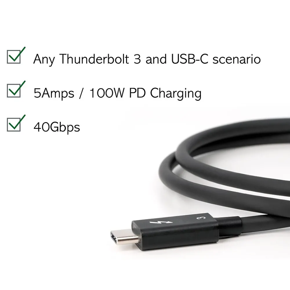 - Thunderbolt 3 cable with 40Gbps speed and USB 3.0 5Gbps compatibility