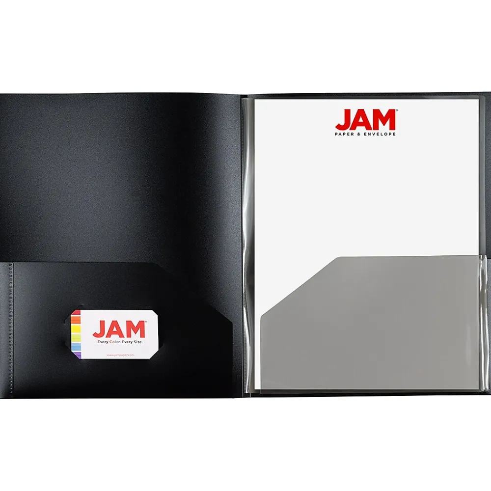 JAM Paper Black 6 Pocket Heavy Duty Plastic Multi Pocket Folders are made out of smooth, heavy duty plastic. These folders measure 9 x 12 inches each. This pack contains 2 folders. Each of these folders has two pockets located on either side of the inside cover. Four additional pockets are included on either side of two translucent plastic sheet pages on the inside of each folder. This means that each of these folders contains a total of 6 pockets to help you store and organize large volumes of papers. Use these multi pocket folders for intensive classes or for those work documents that need to stay orderly and in one place.