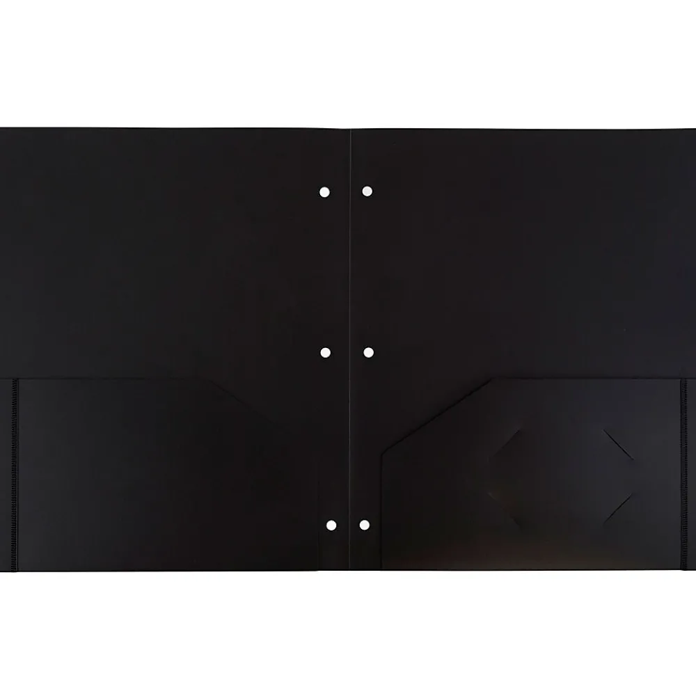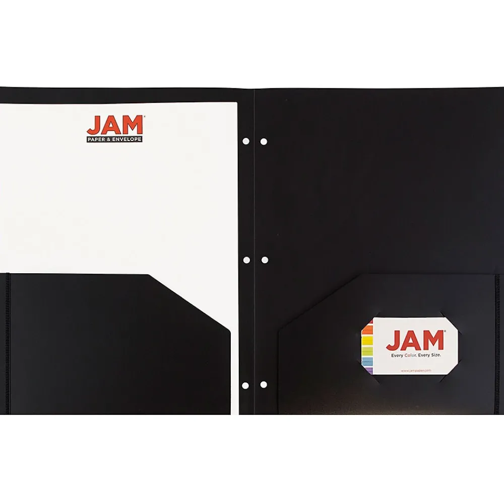 JAM PaperĀ® Black Plastic Two Pocket 3 Hole Punched Presentation School Folders are 9in x 12 inches in size and are made out of heavy duty, pliable plastic. In this large pack, a total of 108 folders is included. Each of these folders features two pockets on the inside. The right side pocket features two slots for business card slots and other small documents. Each folder has three holes in a vertical row on the left the side for placing and securing them into binders. These folders have a jet black color that gives them a versatile edge. Use them in any school or office setting to organize documents and to keep them safe from damage.