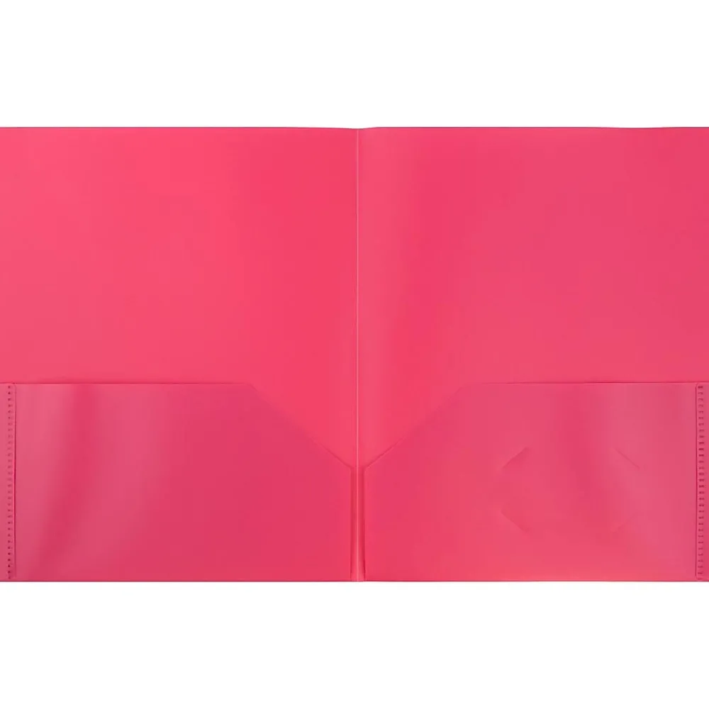 JAM PaperĀ® Fuchsia Pink Plastic 2-Pocket Pop Folders are made out of innovative, earth-friendly, smooth plastic and are sold in packs of 6. Each one measures 9 x 12 inches, making them ideal for standard sized documents. Up to 20 sheets of paper can be stored in each one! On the inside, each of these folders has two pockets for storing and organizing all of your keep-worthy papers. The surface of the right side pocket features a business card sized slot. The bright, flowery pink fuchsia color of these folders is certain to help it stand out from the rest of your office or school supplies so that you can find our stored documents with efficiency and ease!