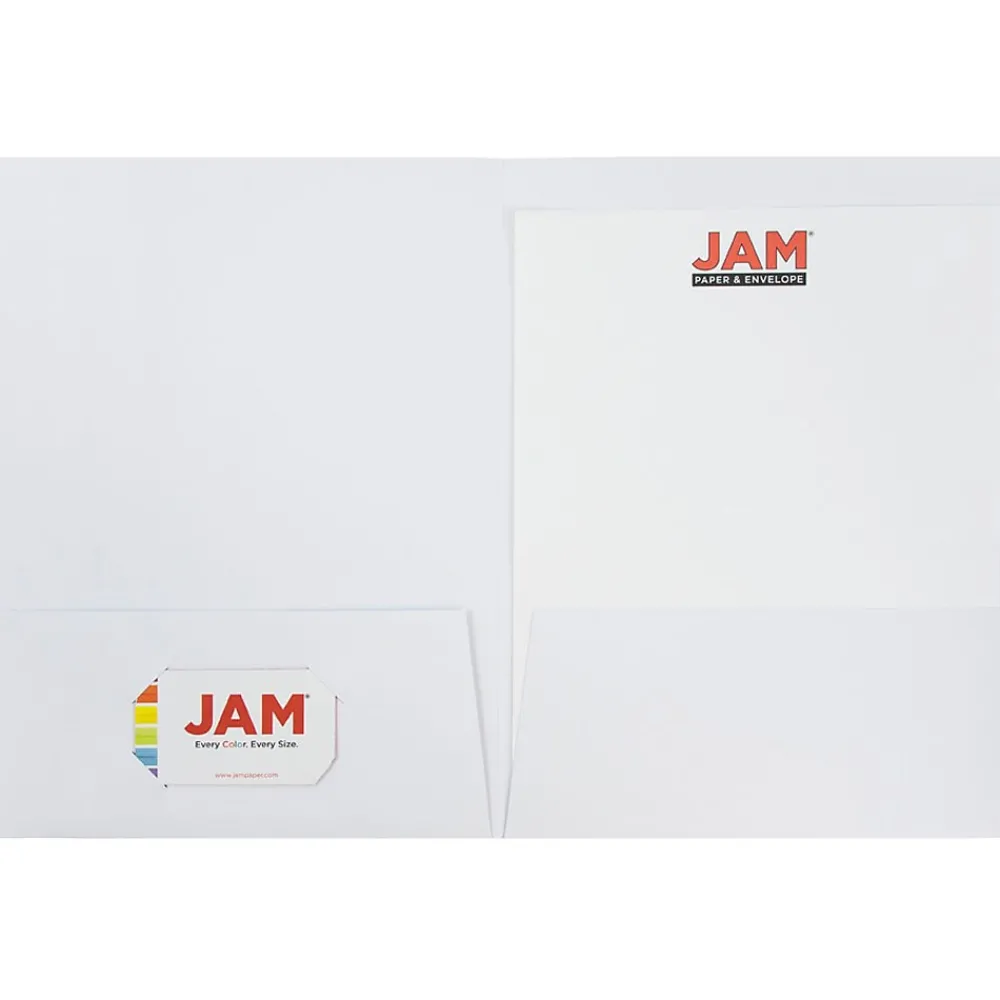 JAM PaperĀ® White Linen Premium Paper Cardstock Two Pocket Presentation Folders are 9 x 12 inches in size and are made of 80lb cardstock. Completely white on both the cover and inside, these folders can be used for any purpose at work, school, or your home. Each one features two pockets on the inside with a business card slot in one pocket. This pack includes 6 folders. Use them to store and protect important documents, projects, records, class materials, notes, presentation items, financial documents, and legal paperwork. Carry them in briefcases or backpacks, or store them on desks and in drawers.