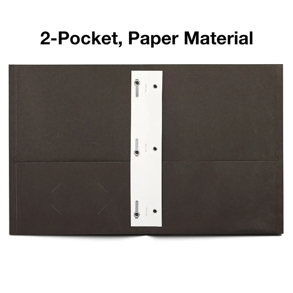 Be prepared at appointments, meetings, and classes with these black folders. These folders come in leatherette-embossed standard-grade stock and include sturdy metal prongs, letting it hold contents securely, while the two interior pockets provide additional storage for unpunched papers. These Staples two-pocket folders come in black and offer a die-cut business card holder, letting you add an extra touch of professionalism to it.