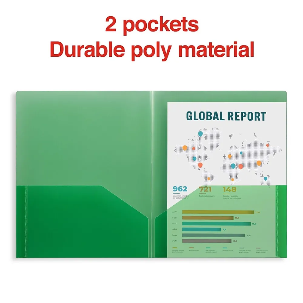 StaplesĀ® 2-Pocket Poly folder in green is made of soft and semi-translucent poly so that contents can be easily identified.
