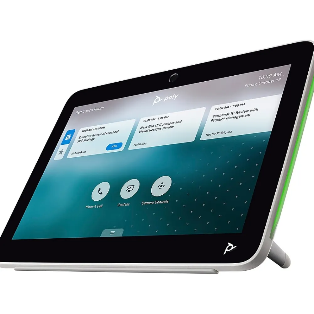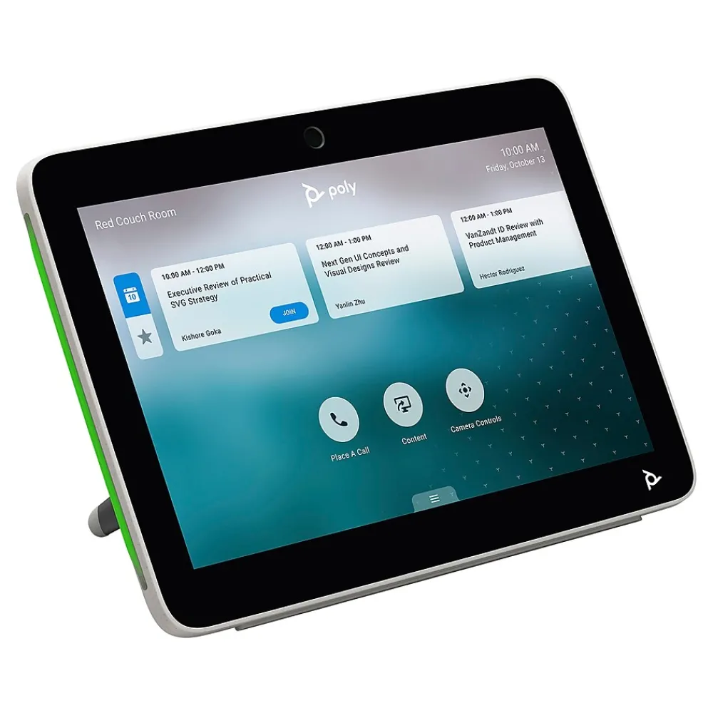 The Poly TC10 touch control panel makes meetings more productive and allows users to easily schedule workspaces and conference rooms as employees find themselves in a flexible working environment. Control video calls in the room and share content with a tap. Or use it outside the room to check vacancy and schedule any bookable space without interrupting. Intuitive controls and multicolor LED lights make it easy to see meeting details and spot open rooms from a distance. Whether you mount it on a wall, on glass, or set it on a table with its flexible, multi-angle stand, you’ve got the secret to true meeting productivity.