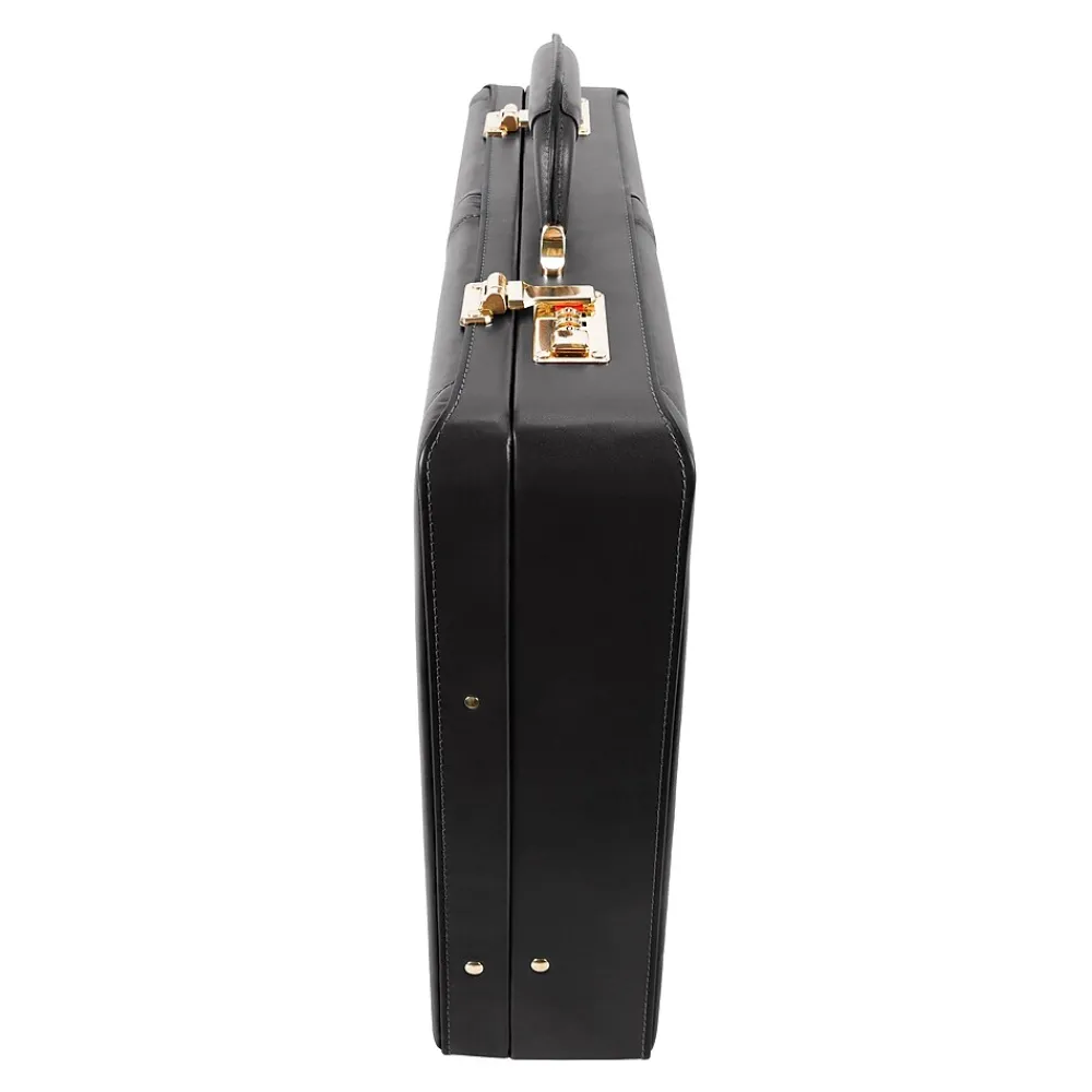 Slim design briefcase. 3-digit combination lock for added security. Gold-finished hardware. Comfortable top carry handle. Protective feet keeps case from falling over. Includes Tablet Pocket.