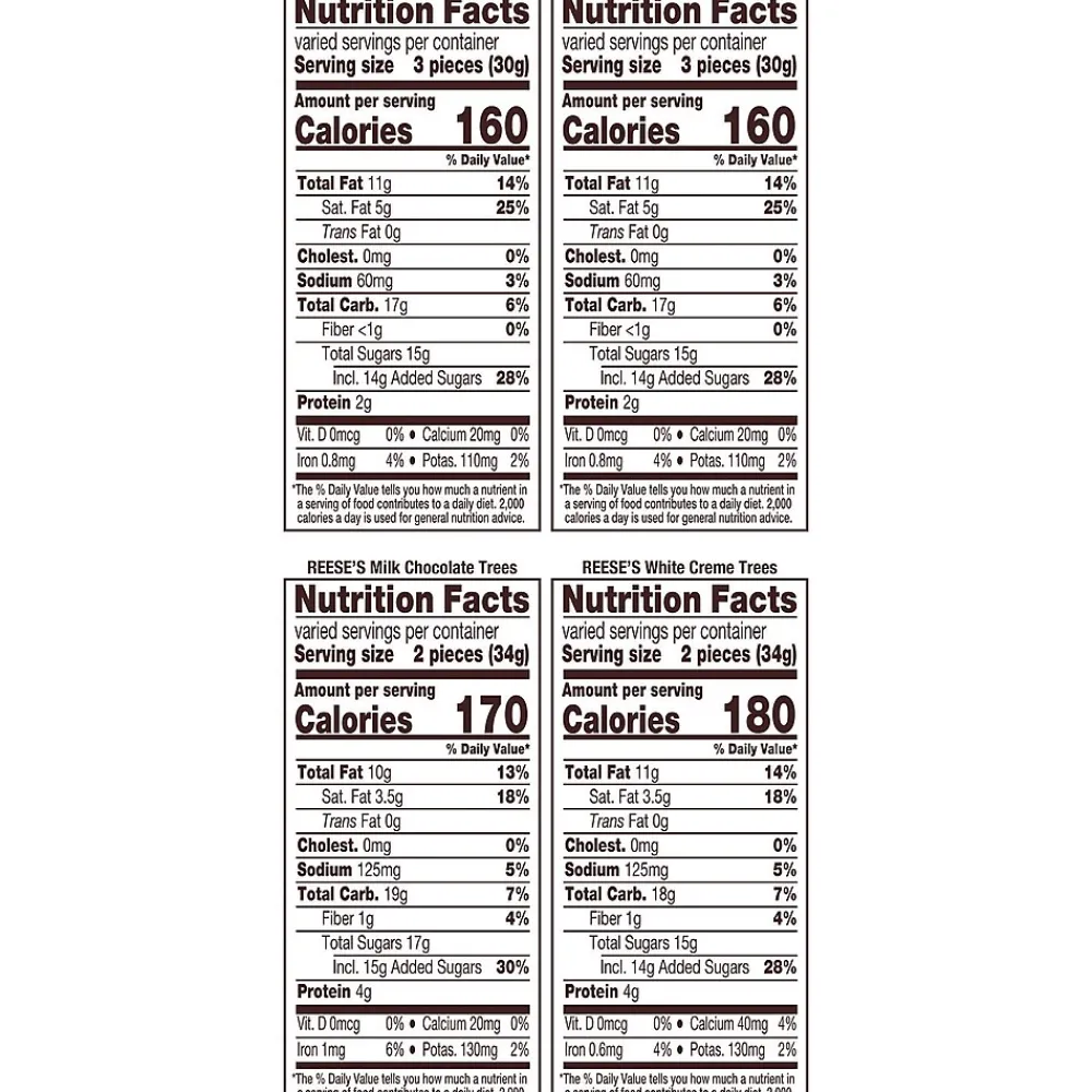 - Includes REESE’S milk chocolate peanut butter trees candy, REESE’S white creme peanut butter trees candy, REESE’S chocolate peanut butter nutcrackers candy and REESE’S chocolate peanut butter mini bells candy