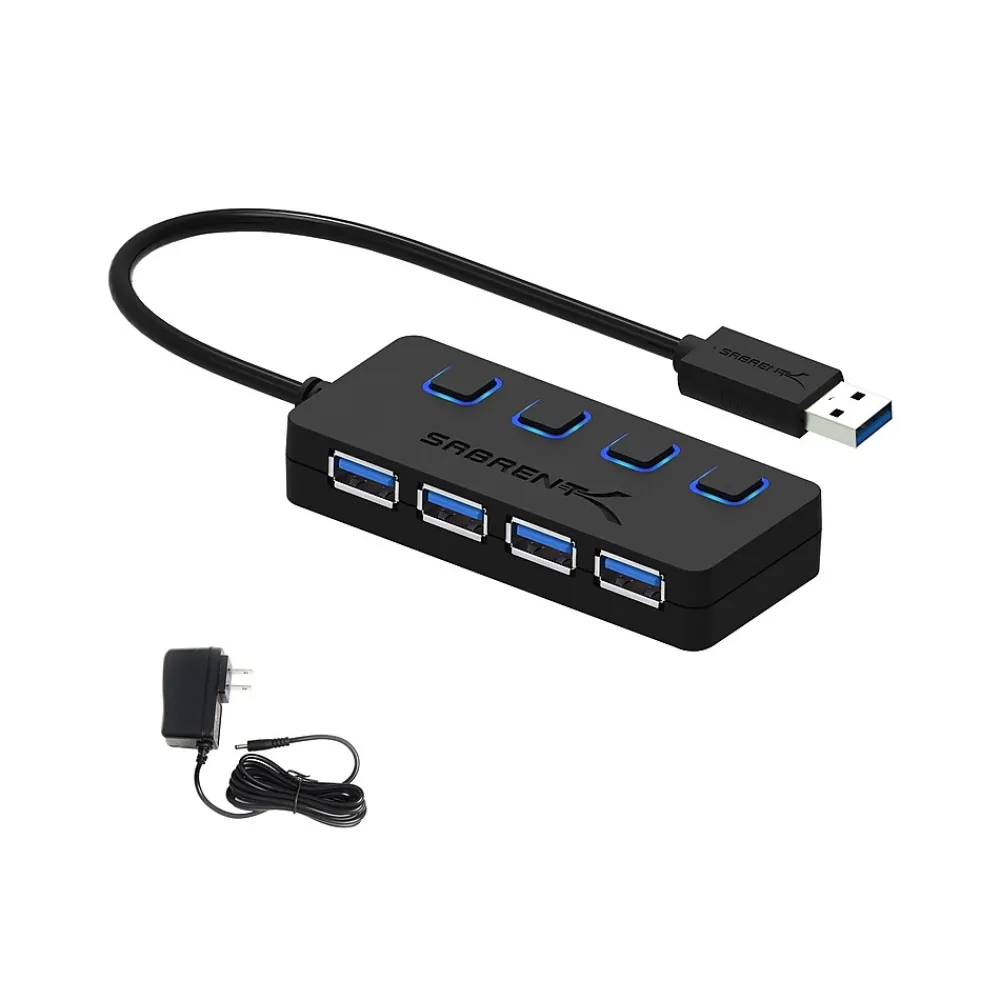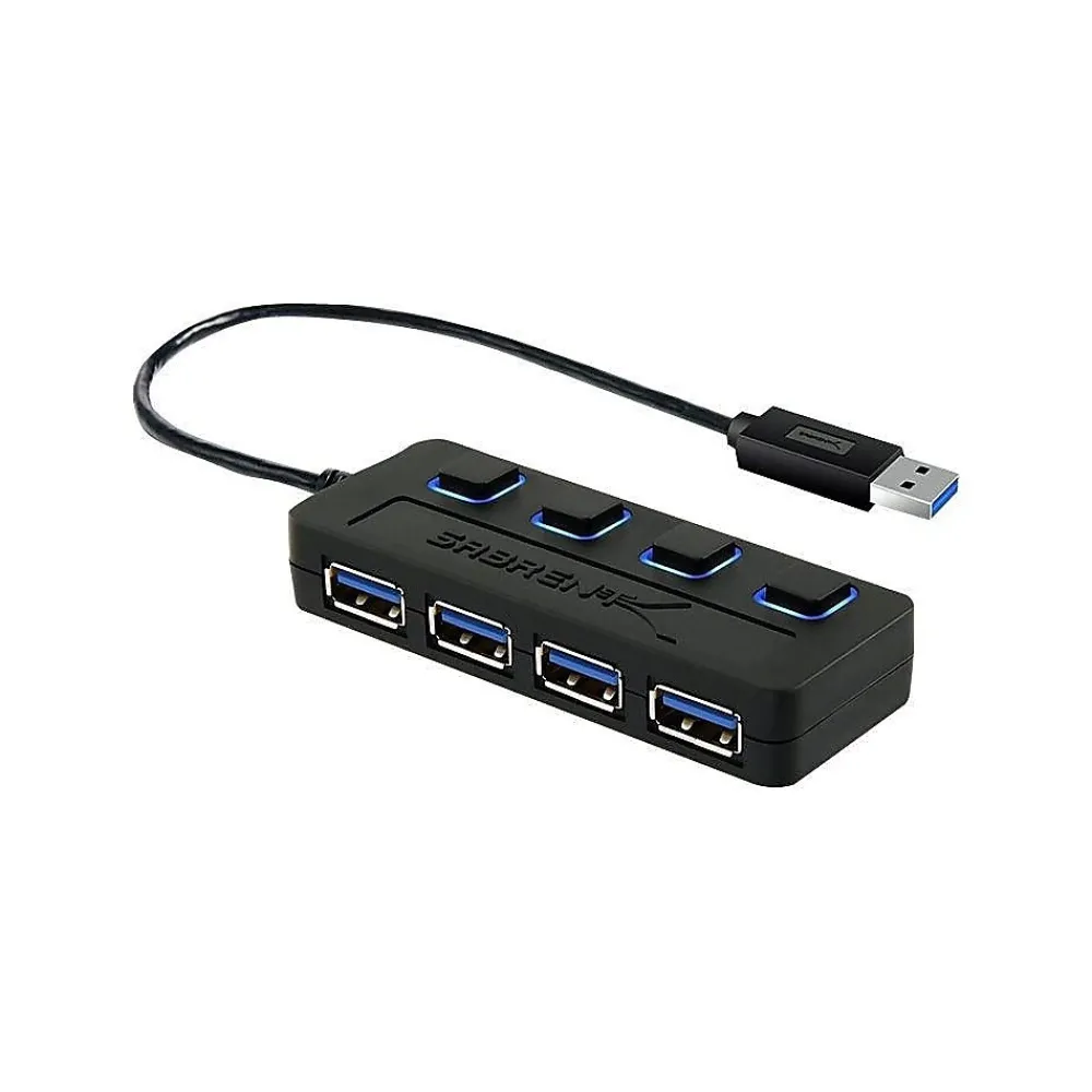 Get more out of your USB ports with this Sabrent four-port USB 3.0 hub. This convenient device plugs into your computer and instantly adds four additional high-speed USB 3.0 ports for syncing and charging a variety of USB-enabled devices. This Sabrent four-port USB 3.0 hub supports speeds up to 5Gbps for fast, easy file transfers.