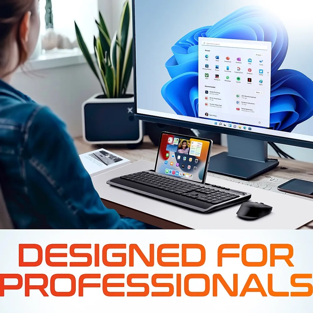- Measuring 17.38″ W x 1.12″ H x 7.86″ D, this keyboard wireless boasts a spacious layout for comfortable typing and fits neatly on your desk.