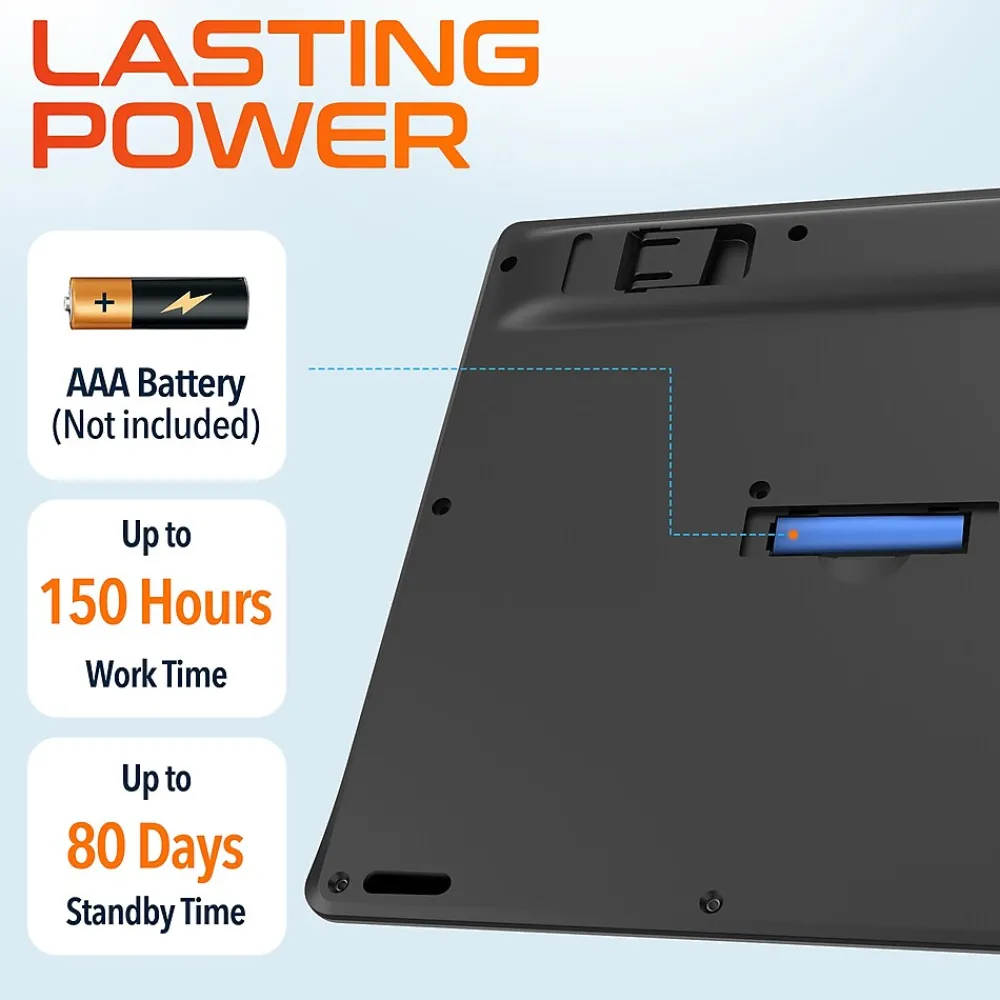 - The office wireless keyboard auto power saver activates after 10 minutes of inactivity, helping to extend battery life and reduce energy consumption.