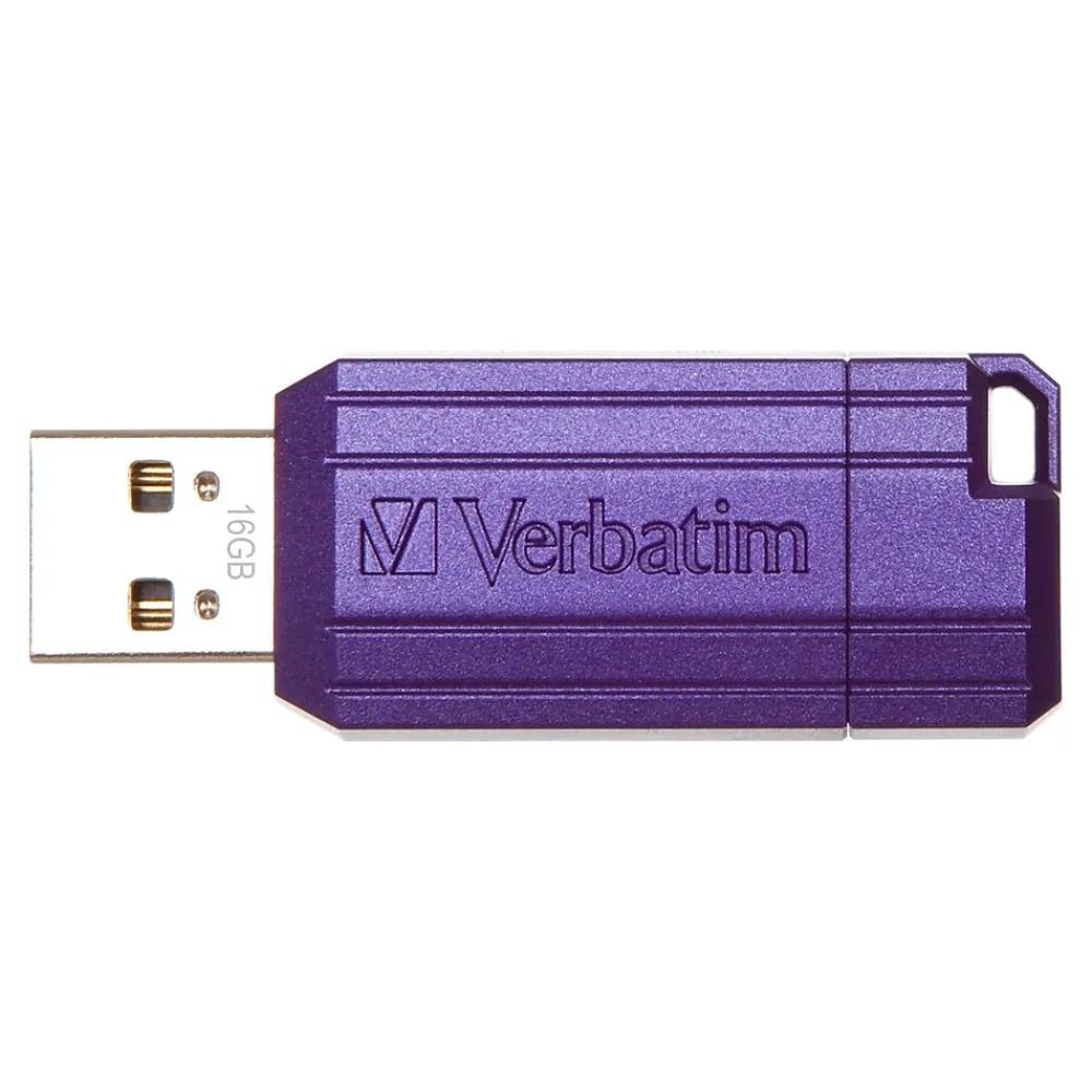 Transfer data or store files with this USB flash drive. The compact size tucks neatly in a bag or pocket for easy storage, while the violet hue and PinStripe design adds appeal. A 16GB storage capacity offers ample space for photos, videos and documents. Featuring a retractable design, this Verbatim PinStripe USB flash drive keeps your digital documents protected from loss.