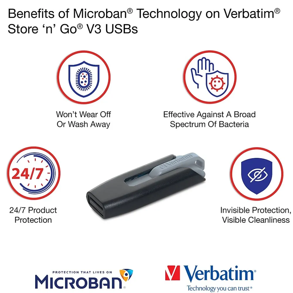 Featuring a cap-less design, the retractable housing protects the USB connector and easily slides in and out. The USB 3.2 Gen 1 interface offers faster data transfer speeds versus USB 2.0 making it easy to transfer multiple files at once or larger files without error. No USB 3.2 Gen 1 ports? No worries! This is drive is backwards compatible with USB 2.0 ports. These Verbatim USB drives include built-in Microban antimicrobial product protection. This antimicrobial technology helps prevent the growth of bacteria – keeping your USB drives cleaner! Disclaimers: Microban® is a registered trademark of Microban Products Company.