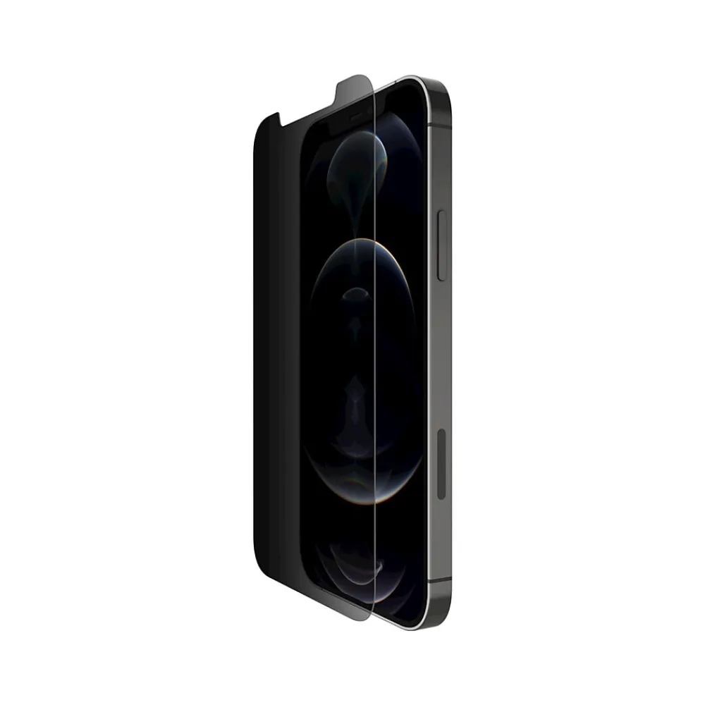 This Belkin SCREENFORCE Tempered Glass privacy screen protector made for iPhone 12 Pro Max offers advanced protection from impacts and nosy onlookers. The glass contains an antimicrobial agent to protect the product from microbial growth, without sacrificing touch-screen response or clarity. The tempered glass privacy treated screen protector offers advanced protection from impacts, scratches, and nosy onlookers. The privacy feature blacks out your screen from the sides in portrait mode, while still allowing you to share content when you want to in landscape. Manufactured using premium Japanese glass, the protector retains the smooth glide and feel of the screen, and is tested extensively to deliver the brightness, sharpness, and clarity you expect from your iPhone.