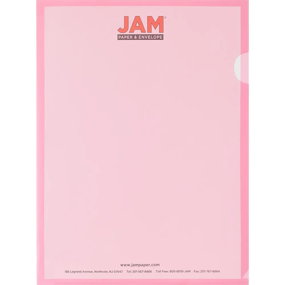 JAM PaperĀ® Red Plastic Sleeves are made from durable, pliable, acid-free, moisture resistant, nonstick, semi-transparent plastic. This pack contains 12 sleeves. Each one measures 9 x 11.5 inches in size, making them ideal for standard sized documents. The left and bottom edges of these sleeves are sealed closed. The top and right side edges are open in order to allow you to slide documents in and out of the sleeve. The right edge also features two indented notched to help you lift the top cover to fit documents inside. These sleeves feature a light, pinkish red color that stands out and helps you color categorize your documents. The semi transparent plastic allows you see and read documents from the outside.