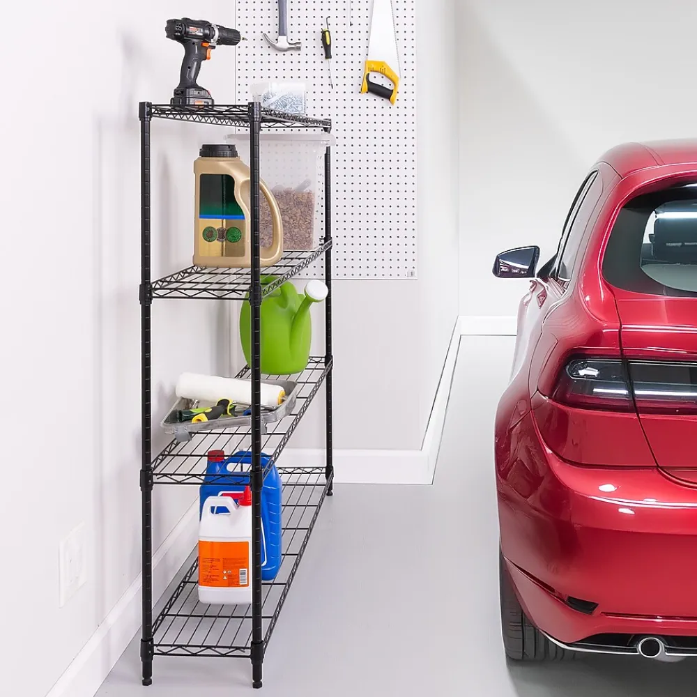 Optimize your storage space with the 4-Tier Slim Profile Wide Shelving Unit, perfect for narrow yet wide spaces in your home. Measuring 48 inches in length and only 10 inches in depth, this unit is ideal for fitting against longer walls, behind furniture, or under windows in garages, pantries and basements. With height-adjustable shelves and a sturdy construction that supports up to 100 lbs per shelf, this rust-resistant steel organizer offers both durability and flexibility. Easy to assemble with no tools required, it features leveling feet and plastic couplers, ensuring a sleek and organized storage solution for any small space.