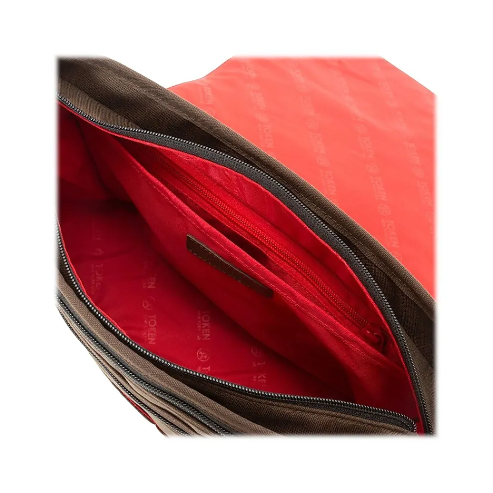 Token Sheridan shoulder bag has a waxed nylon body, leather flap and base, and a cotton shoulder strap. Both practical and large, this fashionable shoulder bag tastefully delivers your laptop and other belongings to your destination in an organized fashion. The soft leather flap hides two external, zipper pockets and five small compartments (three minis, one small, and one medium). The main nylon compartment has a zipper closure that is expandable vertically so the main compartment can grow as your belongings do too. The Token Sheridan waxed nylon shoulder bag (M) is used by students and professionals alike and can seamlessly make the transition from one to the other.