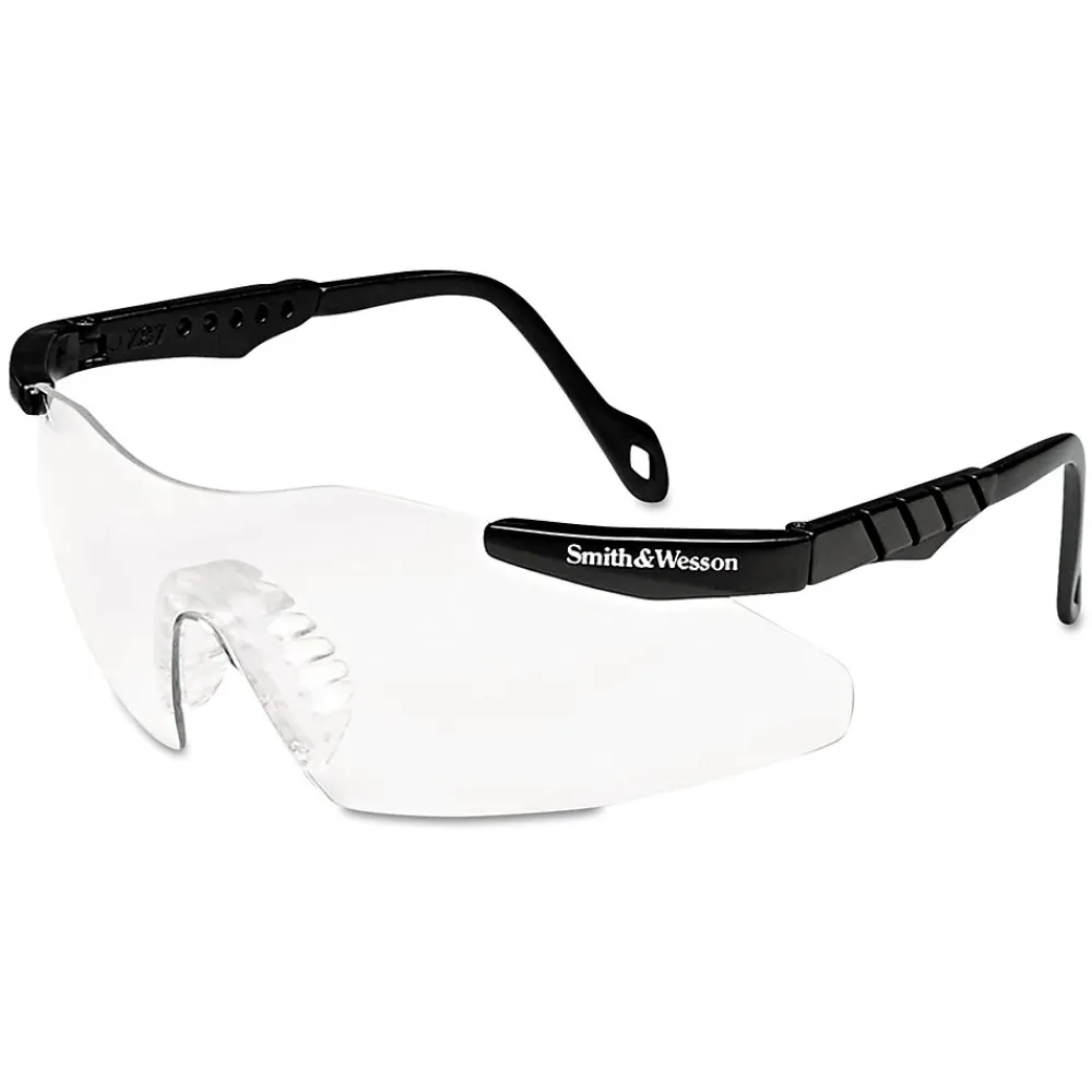 Smith & Wesson® Magnum series clear shooting glasses has self-adjusting rubber nose pad with rubber fingers that creates a comfortable fit for almost any wearer. Safety glass features sturdy, polycarbonate lenses which offer UV protection.